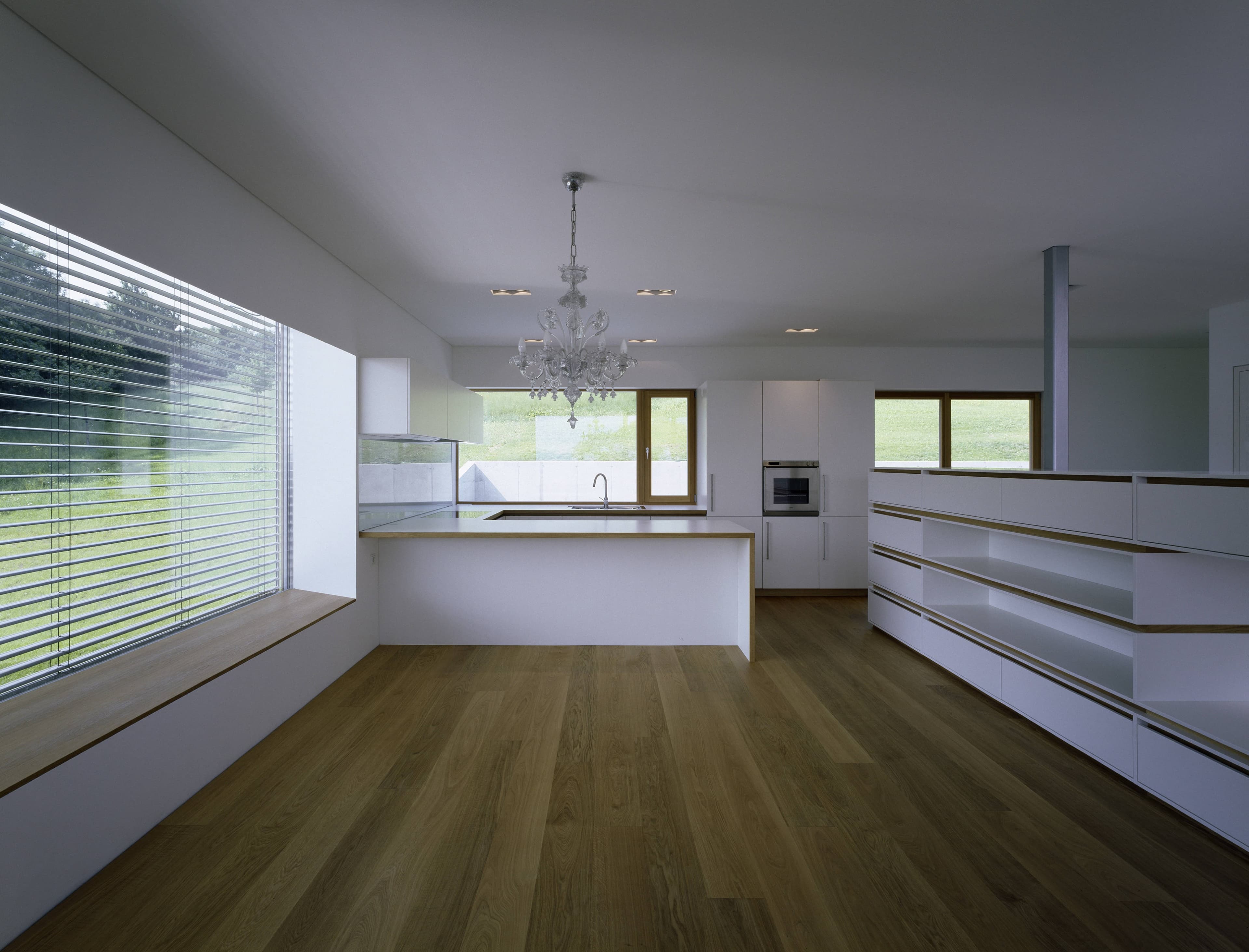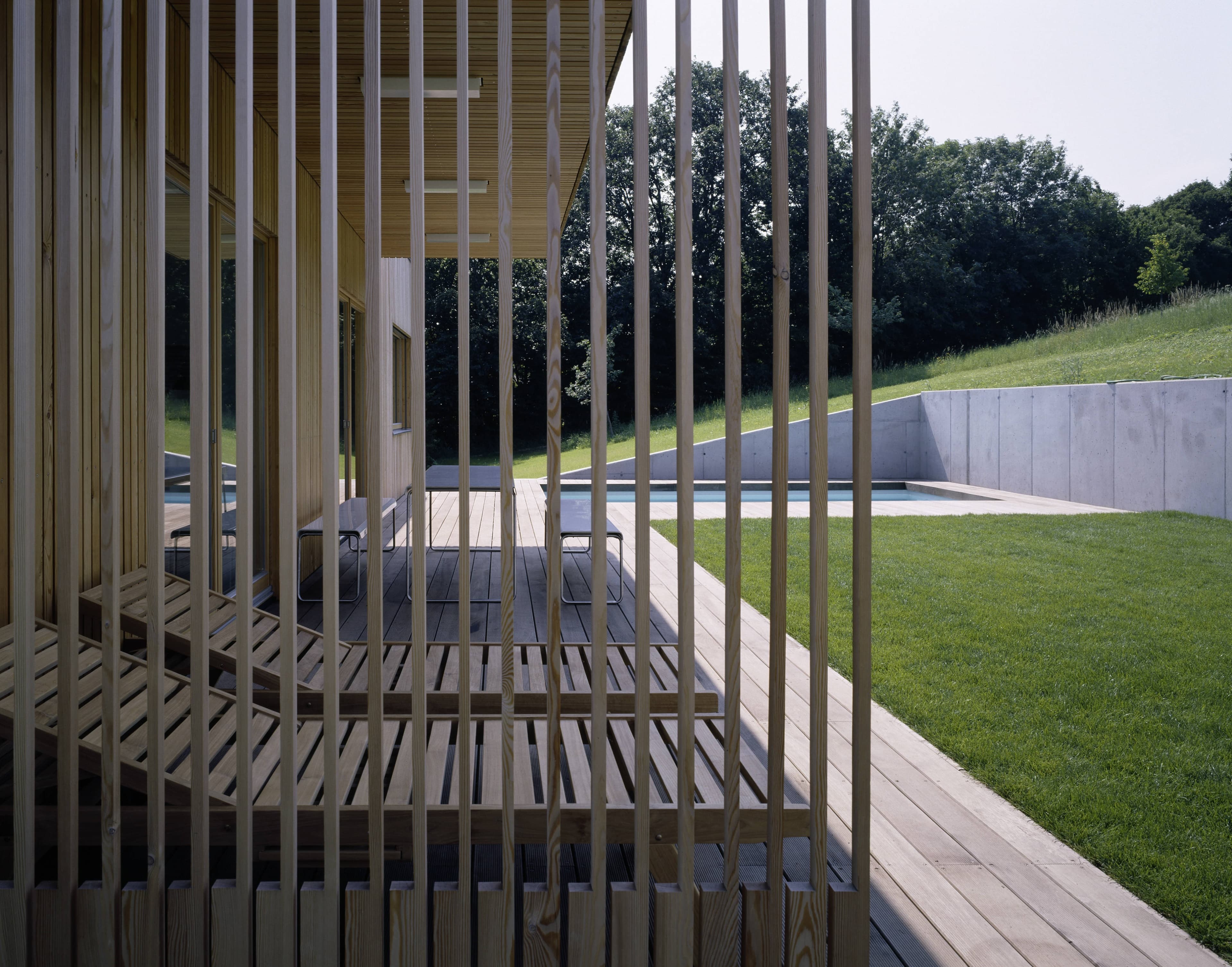 Sanft, aber massiv in den nordseitigen Hang gegraben, erhebt sich das Obergeschoss in Holz über die Weinberge von Niederösterreich. Die Terrassen und der Pool lassen den Wohnraum mit der Landschaft verschmelzen. Schlicht und echt die Materialisierung, sowohl im Hanggeschoss mit Eingang, Kinderzimmern und Nebenräumen, als auch im Obergeschoss mit Aufenthaltsräumen der Bauherren.