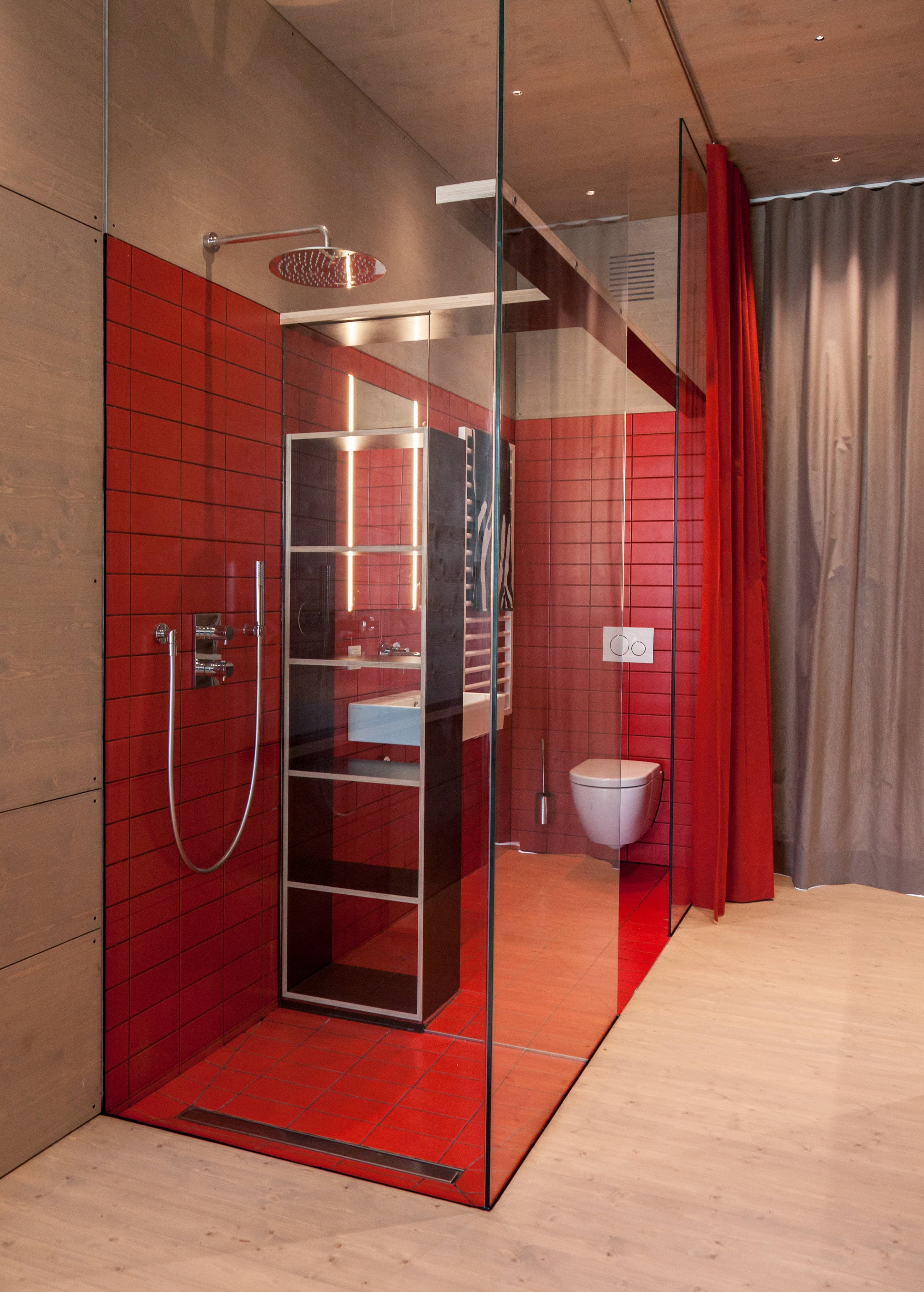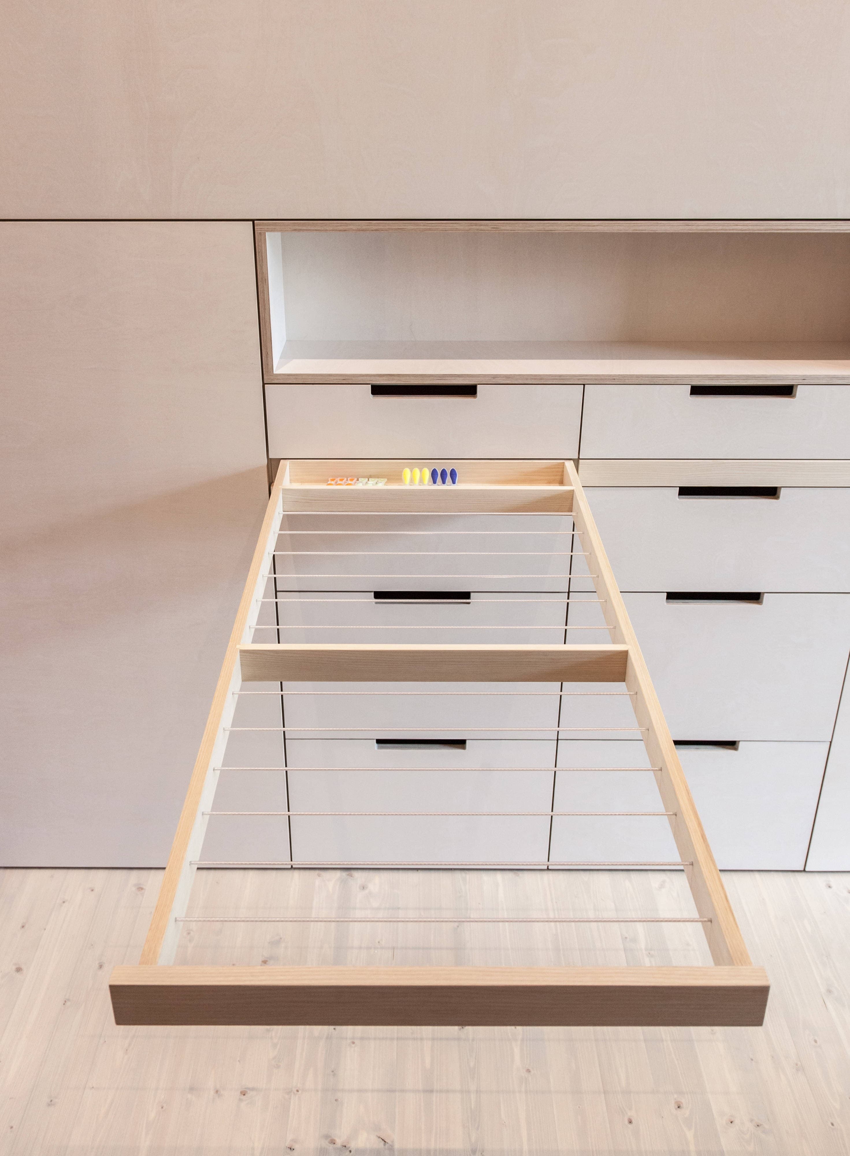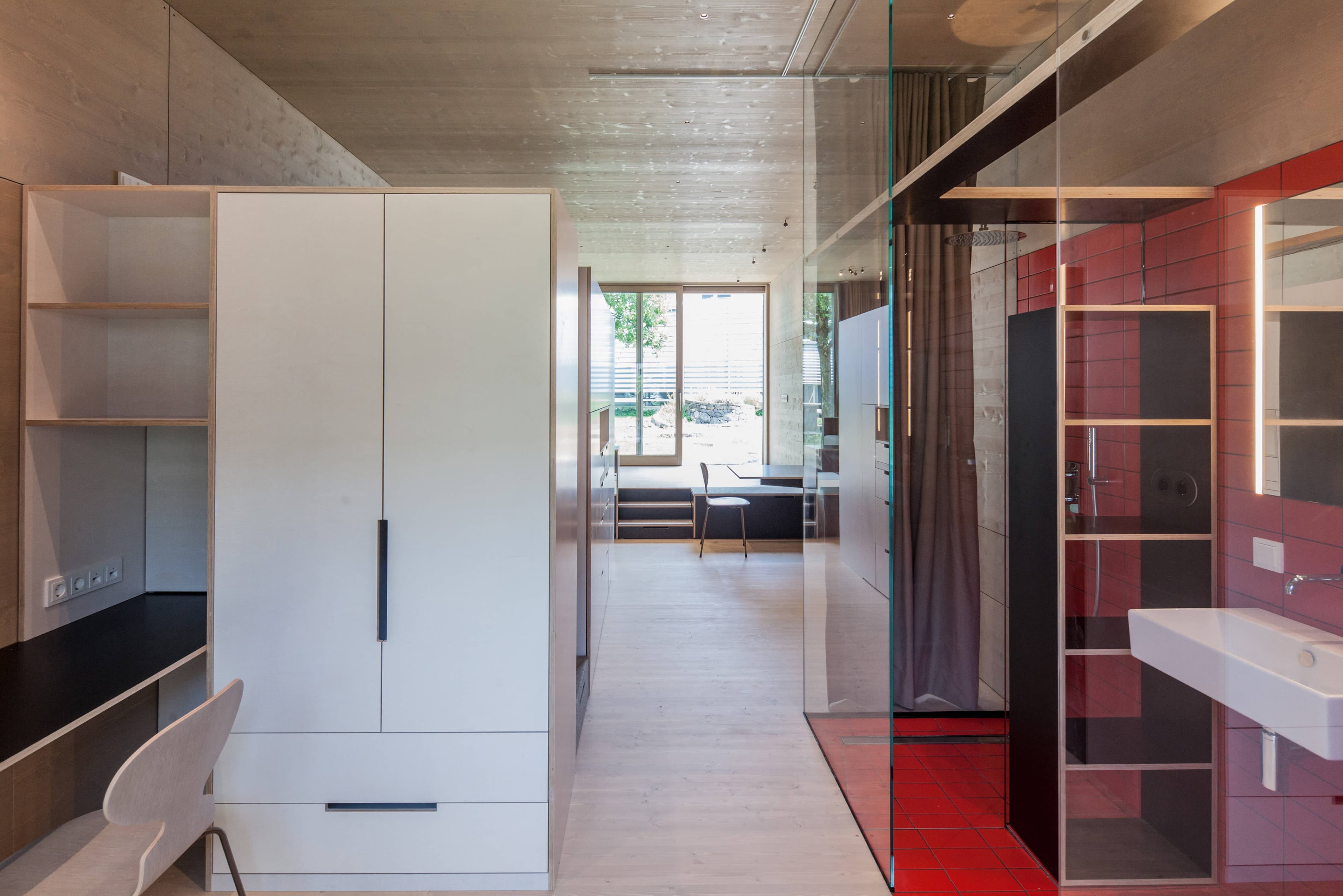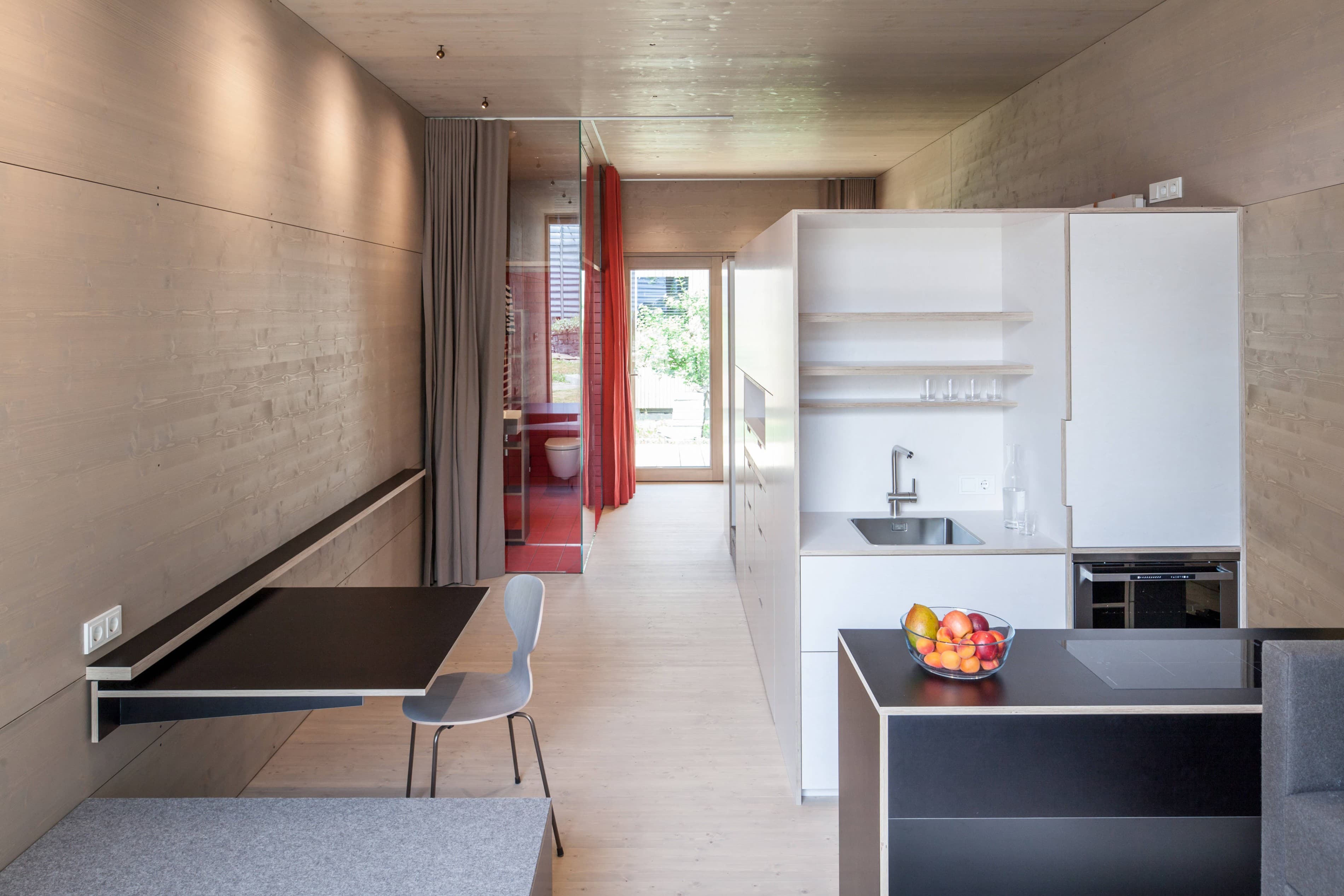Das K33 ist eine in sich geschlossene Wohneinheit, welche den Ansatz hat, auf möglichst wenig Grundfläche, möglichst viel Nutzungen zu ermöglichen, ohne dafür auch nur im Geringsten auf Komfort zu verzichten. Das Wohnen, wie wir es gewohnt sind, soll ohne verschieben oder umbauen von Einrichtungen funktionieren. Ein Sofa bleibt Sofa und wird nicht zum Bett umgebaut. Ein Esstisch bleibt Esstisch und muss nicht noch Arbeitsplatz sein. Unter der Treppe ist eine Waschmaschine verstaut, aufhängen kann man die Wäsche an einer im Schrank eingebauten Wäscheleinenlade. Bis zu 4 Personen können übernachten, was speziell bei Patchworkfamilien oft notwendig und angenehm ist – und trotzdem hat jeder seinen Bereich. Das alles würde auf 33 m² nicht funktionieren, wenn nicht die dritte Dimension, die Höhe auch ausgenutzt wird. Der Innenraum mit einer lichten Raumhöhe von 3 m ist notwendig für Nutzungen und vermittelt überdies einen großzügigen Raumeindruck – man hat nie das Gefühl von Enge oder Platznot. Dies auch deswegen, weil auch jede nur so kleine Ecke für geschlossenen Stauraum für Schi, Koffer, Winterkleidung, Staubehältnisse, und alles was man so braucht ausgenutzt werden kann.