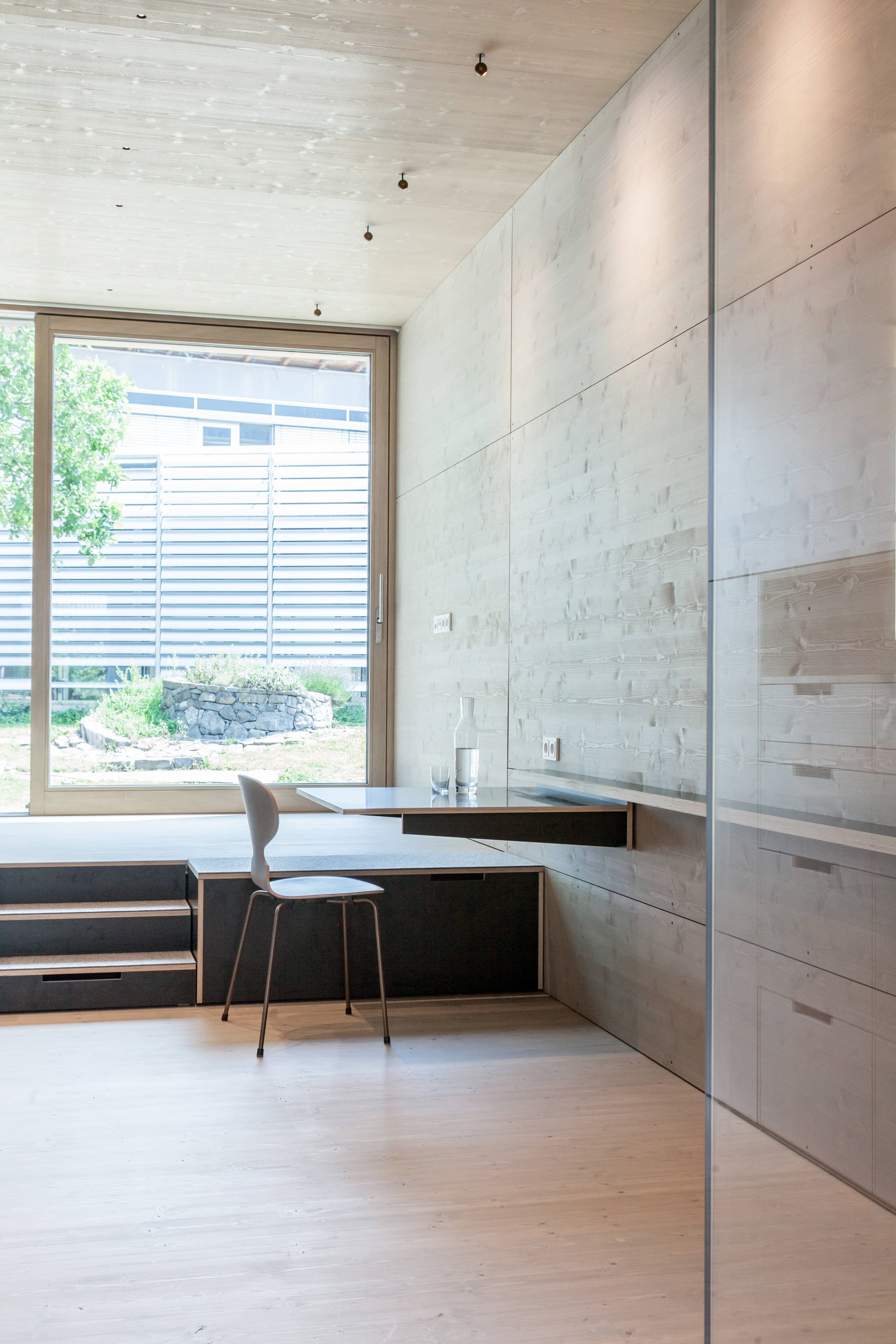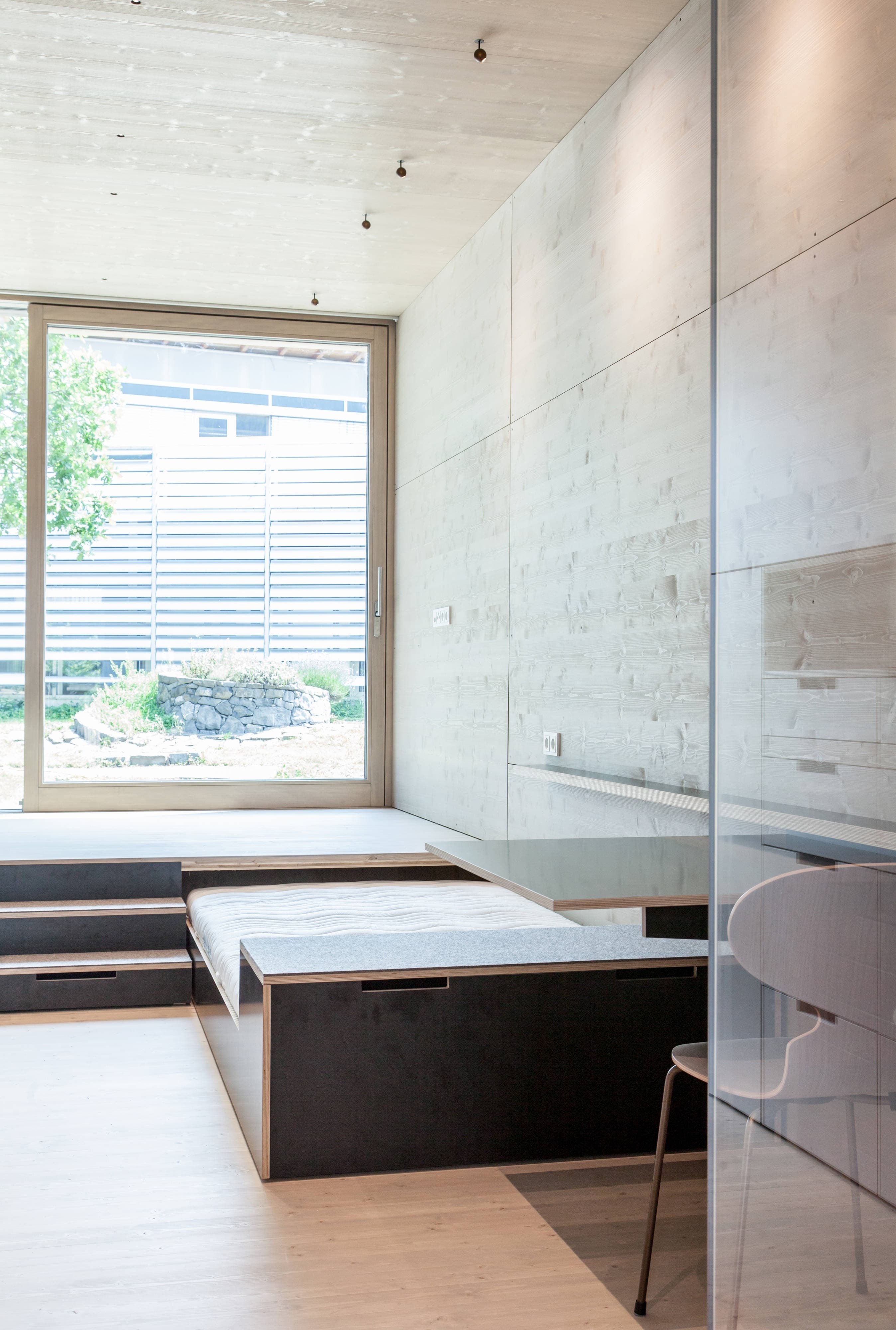 K33 ist sowohl als Einzelgebäude einsetzbar, zeigt aber bei der Stapelung von vielen Modulen seine wahre Stärke. Das längliche Modul ist an beiden Schmalseiten belichtet, somit gibt es einen privaten Freiraum beim Wohnzimmer und einen kommunikativen Freiraum beim Eingang, um mit anderen Gleichgesinnten die Erschließungszone des Gebäudes zu beleben. Konstruiert ist das modulare Gebäude in reiner Holzbauweise als Rahmenbau mit dem Ansatz, sehr wenige Materialien im Ausbau zu verwenden. Boden, Decke und Wand aus gebeizter, heimischer Fichte werden ergänzt durch Sperrholzmöbel.