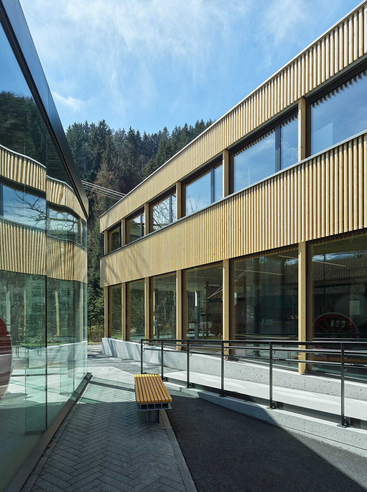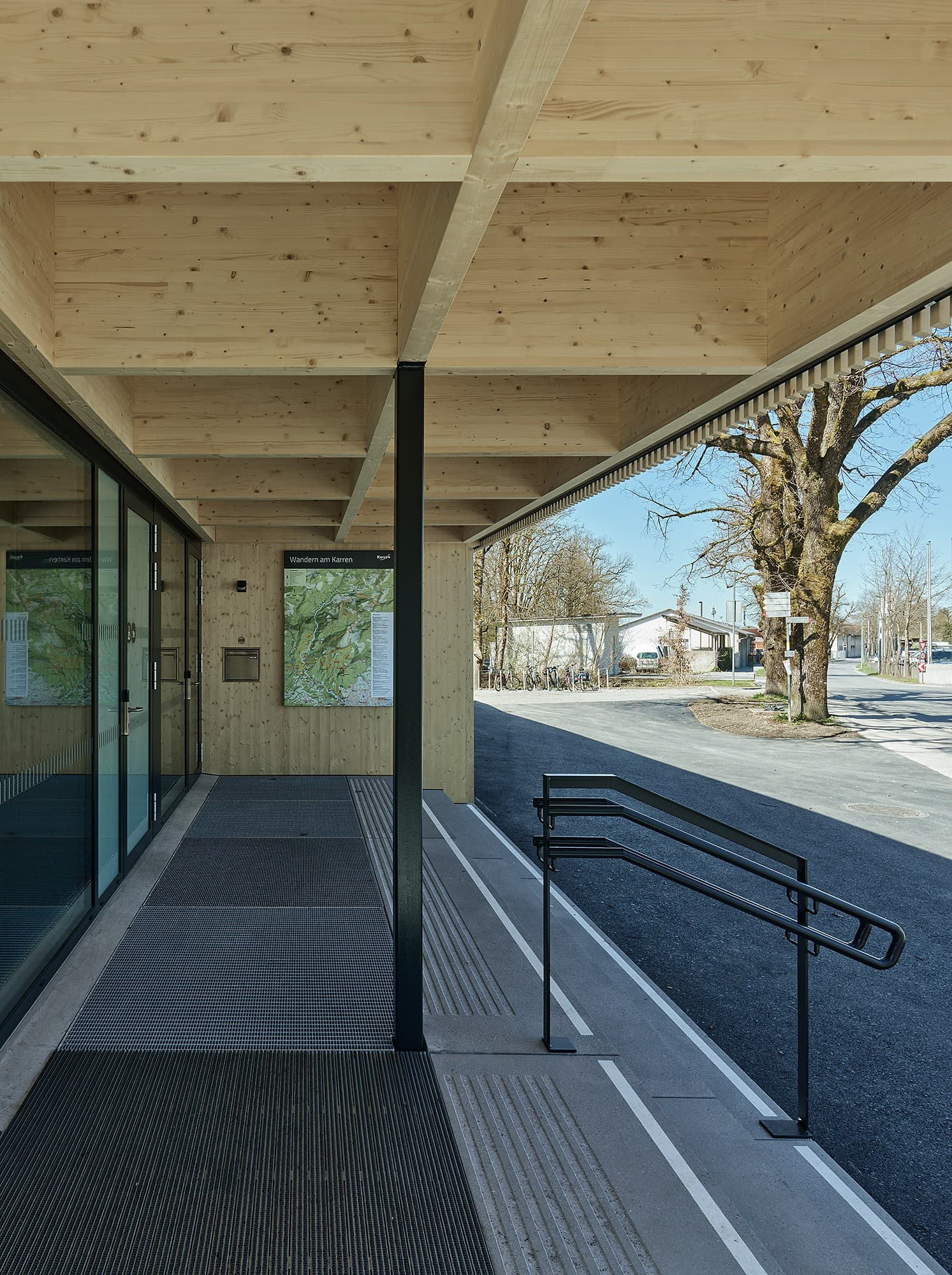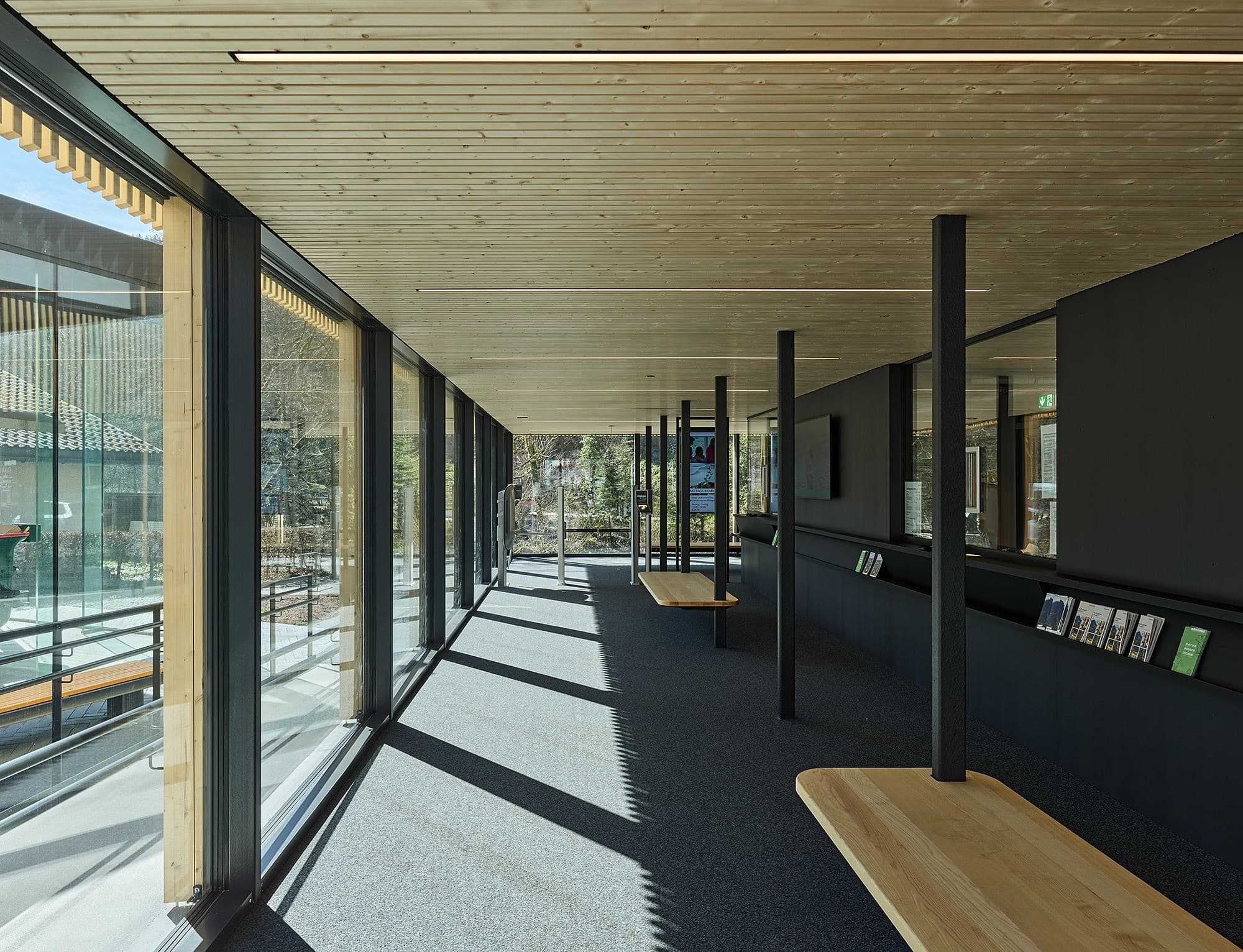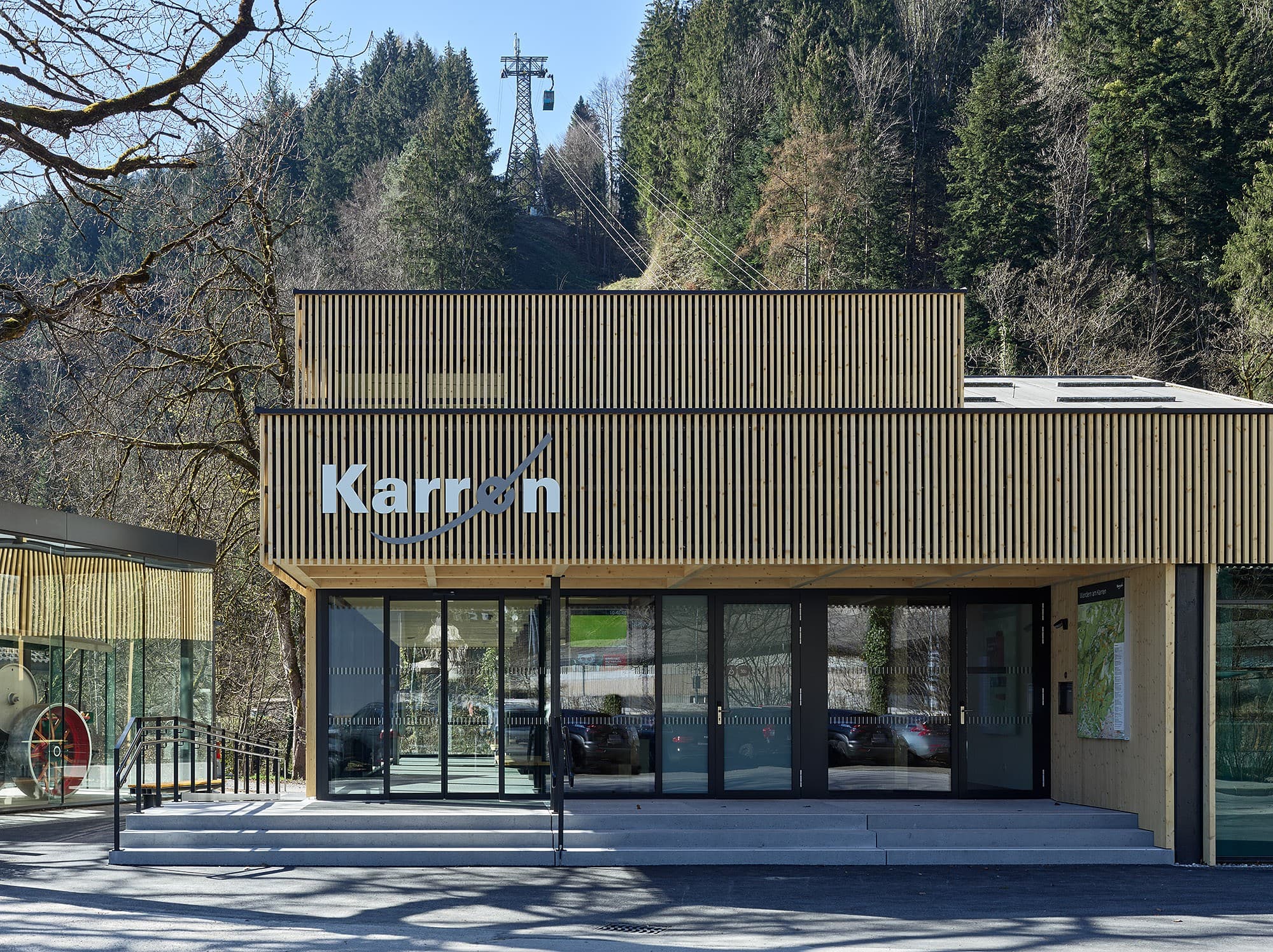 Der Umbau und die Erweiterung der Talstation wurden durchgeführt, um diese für die aktuellen und zukünftigen Anforderungen zu rüsten. Als beliebte Attraktion ist die Seilbahn ganzjährig in Betrieb, weshalb eine kurze Bauzeit von nur drei Monaten ein entscheidendes Kriterium in der Planung war. Besonderer Wert wurde daraufgelegt, den Bestand weitestgehend zu erhalten und durch gezielte Anbauten in Holzbauweise sinnvoll zu ergänzen. Die Eingangshalle mit Kassen- und Wartebereich wurde erweitert, und im Obergeschoss entstanden Büroräume, die den modernen Arbeitsanforderungen gerecht werden. Auf der westlichen Seite der Station wurde eine Anlieferung für den Gastronomiebetrieb der Bergstation geschaffen. Zudem wurden öffentliche Toiletten sowie überdachte Fahrradabstellplätze eingerichtet. Die bestehende Teilunterkellerung wird heute als Fläche für Personal- und Technikräume genutzt.