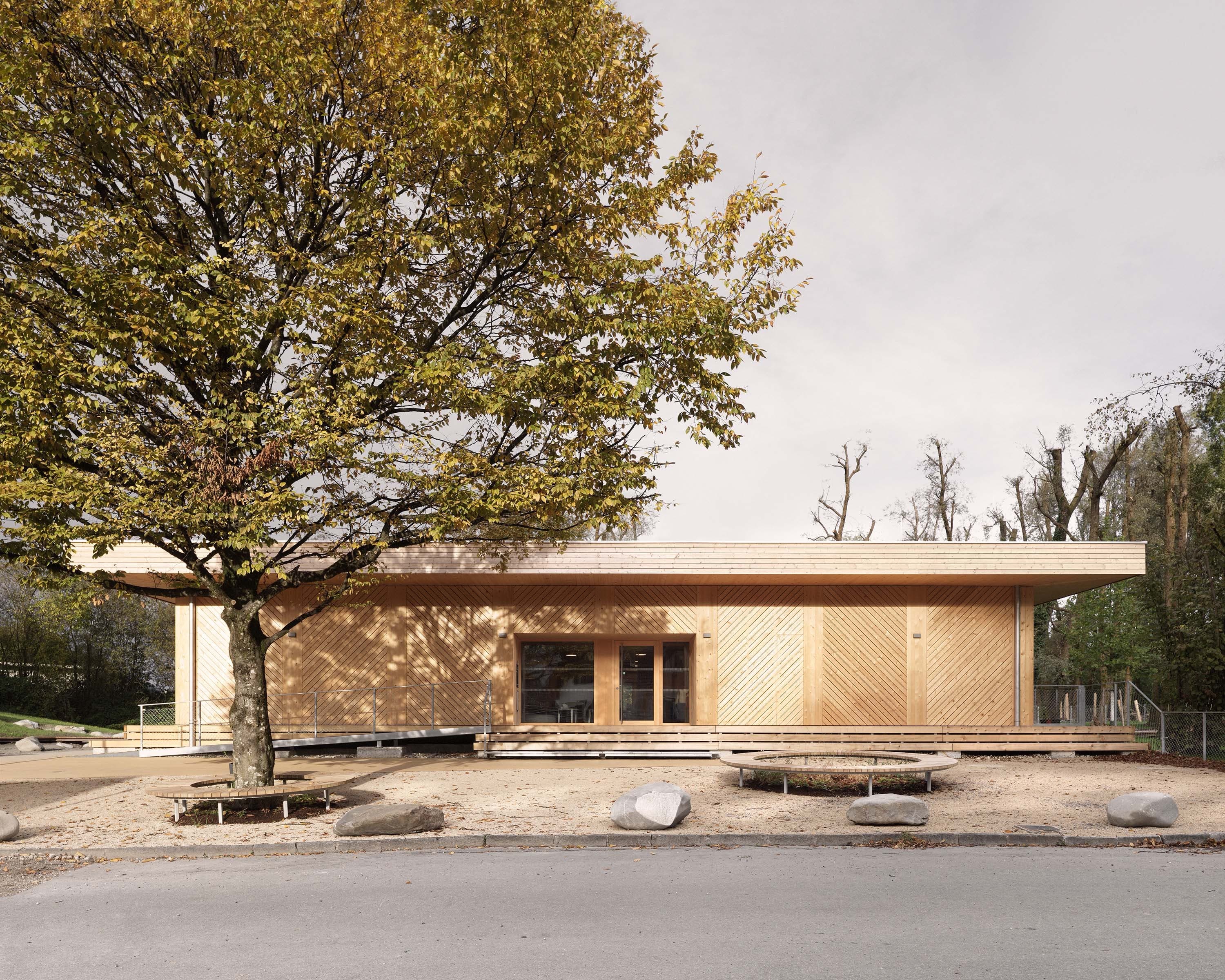Im Ortsgebiet Niederbahn der Stadt Dornbirn wurde ein Naturkindergarten in Form eines eingeschossigen Pavillons in Holzbauweise errichtet. Das pädagogische Konzept sieht vor, dass die Kinder möglichst viel Zeit draußen verbringen. Aufgrund dieser Regelung, konnten 60 Prozent der Fläche gegenüber einem herkömmlichen Kindergarten eingespart werden. Aufbauend auf diesem Konzept wurde der Kindergarten mit einer umlaufenden, überdachten Zone angelegt, über die jede Gruppe autark von außen erschlossen wird. Im Inneren sind alle vier Kindergartengruppen um den zentralen Multifunktionsraum herum angelegt. Die klare Konstruktion in einem 2,5 m x 2,5 m Raster schafft die Grundlage für eine materialsparende Holzkonstruktion, bei der Vollholzquerschnitte einschließlich der Seitenware verwendet werden, um damit die Materialausbeute pro Baumstamm auf ein Maximum zu erhöhen. Generell wurde ein hoher Anspruch an die Nachhaltigkeit des Gebäudes gesetzt. Holz aus dem städtischen Forst, nicht verklebte, sortenreine und dadurch kreislauffähige Konstruktionsdetails sowie ausschließlich schadstofffreie Produkte, sorgen für ein nachhaltiges, emissionsarmes und gesundes Gebäude. Umlaufende, an der Decke angebrachte, offene Versorgungskanäle ermöglichen eine einfache Wartung der verbauten, ebenfalls sichtbaren, Haustechnik.