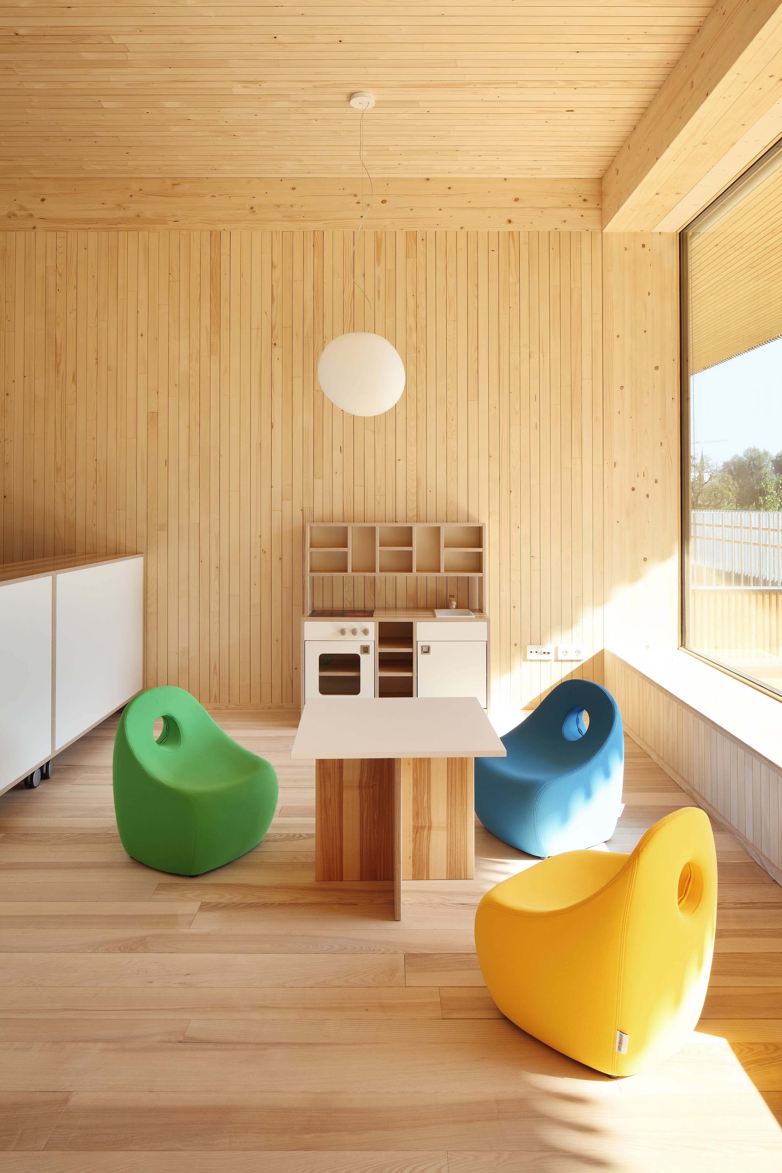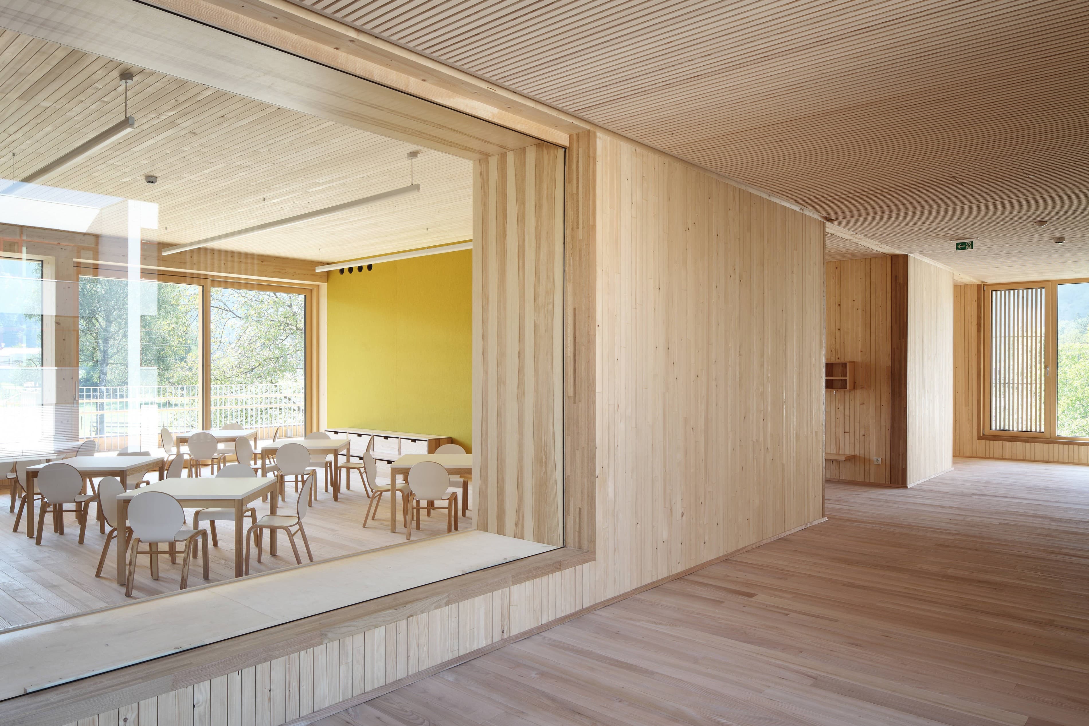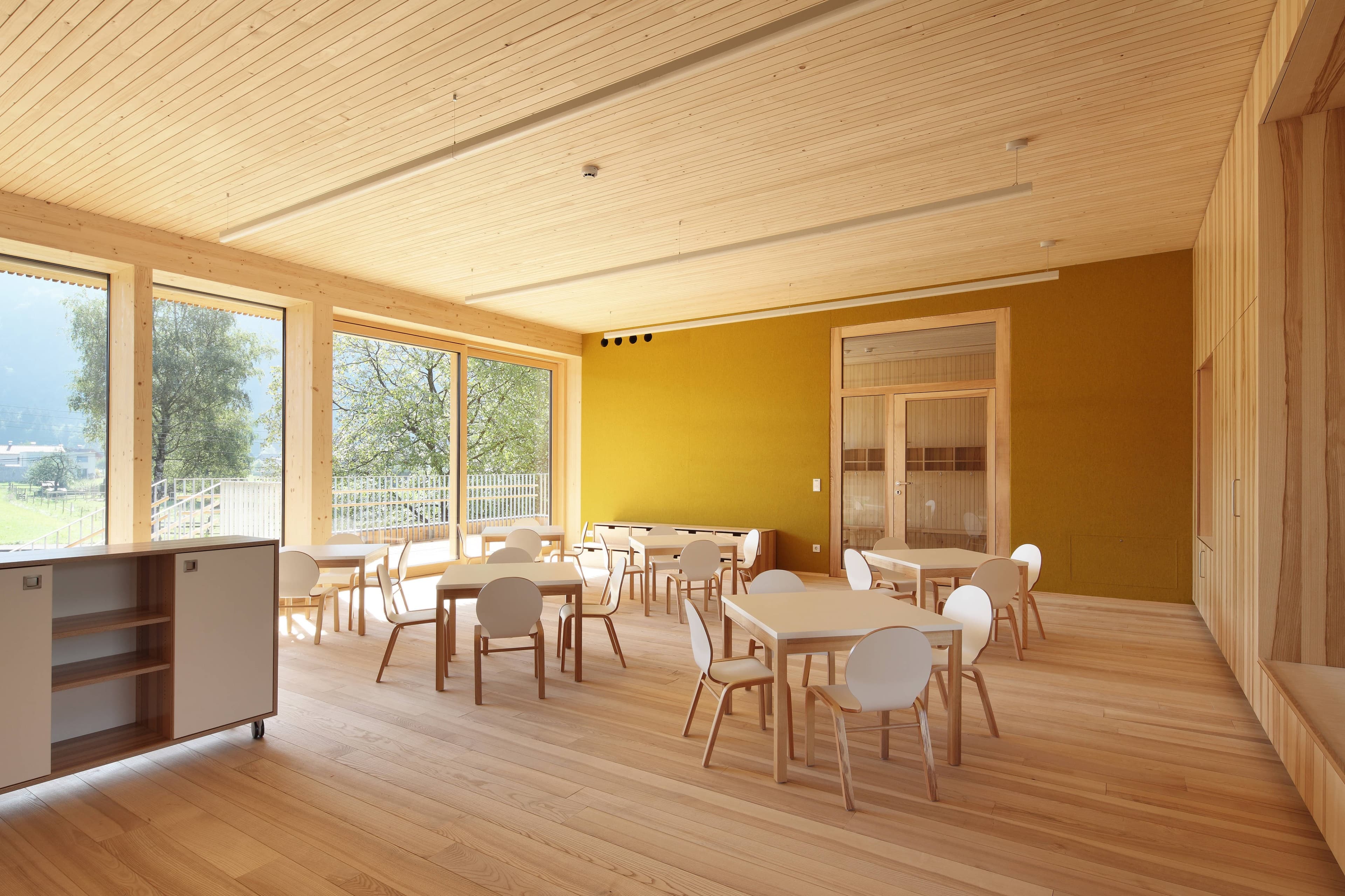 Die Gruppencluster organisieren sich um den zentralen Garderobenbereich, von dem aus der Gruppenraum, der Ausweichraum sowie der überdachte Außenbereich erreichbar sind. Über außen liegende Stiegen im Bereich der Überdachung wird auch den Gruppen im Obergeschoss der direkte Gartenzugang ermöglicht. Die Gruppenräume sind zu den überdachten Außenbereichen großzügig verglast, mit den gegenüberliegenden Oberlichtern wird eine angenehme Belichtungssituation geschaffen.