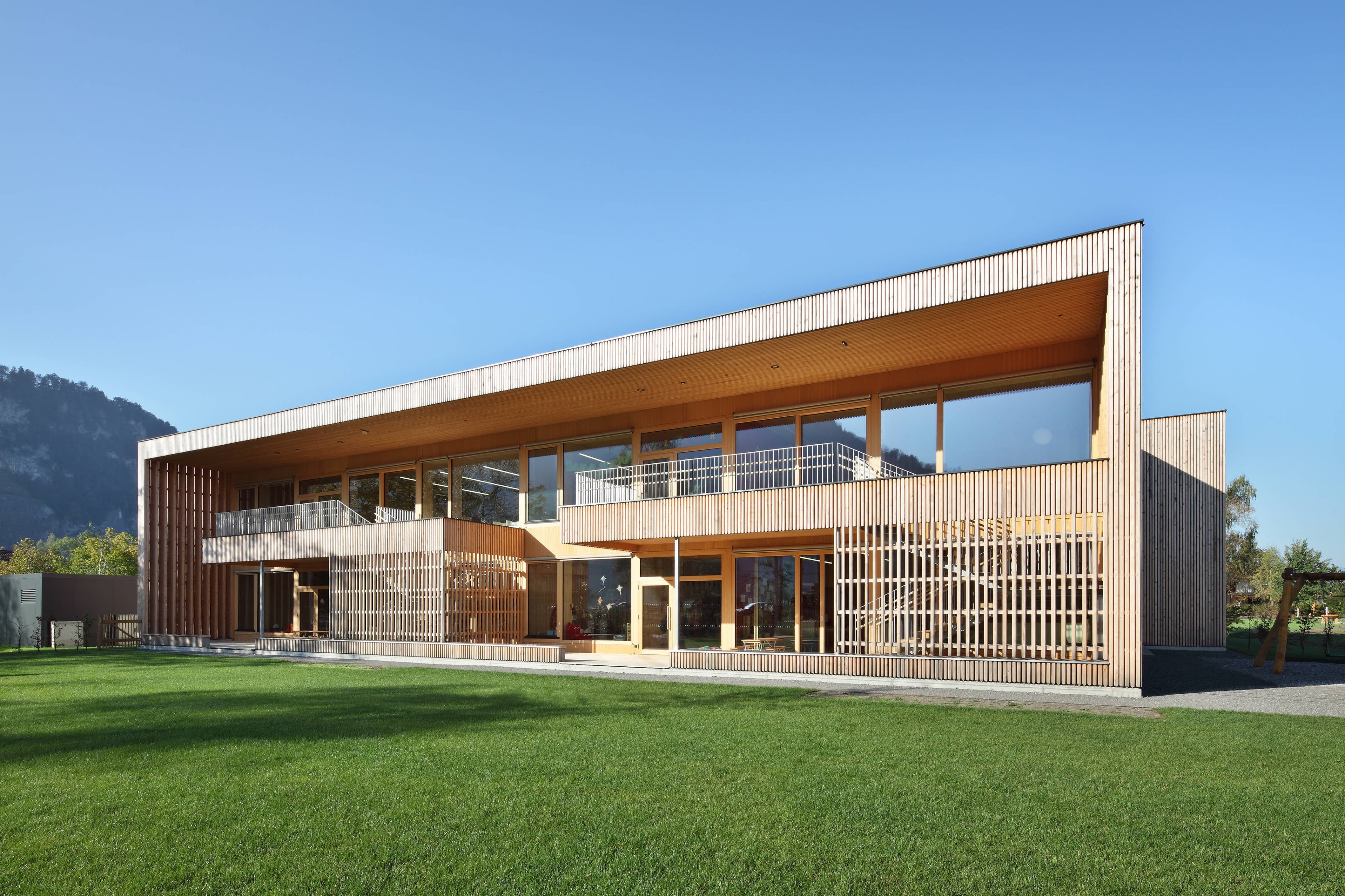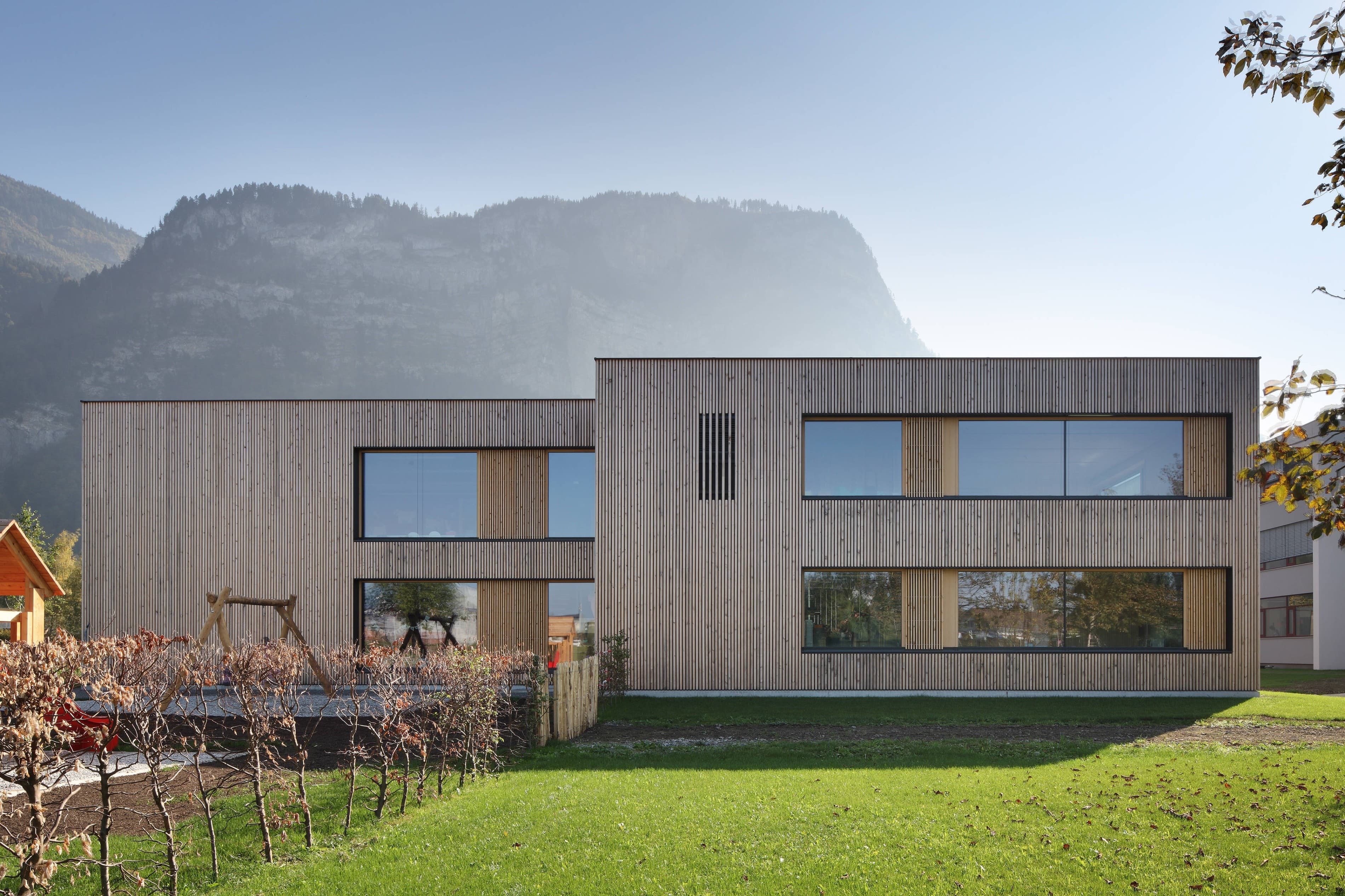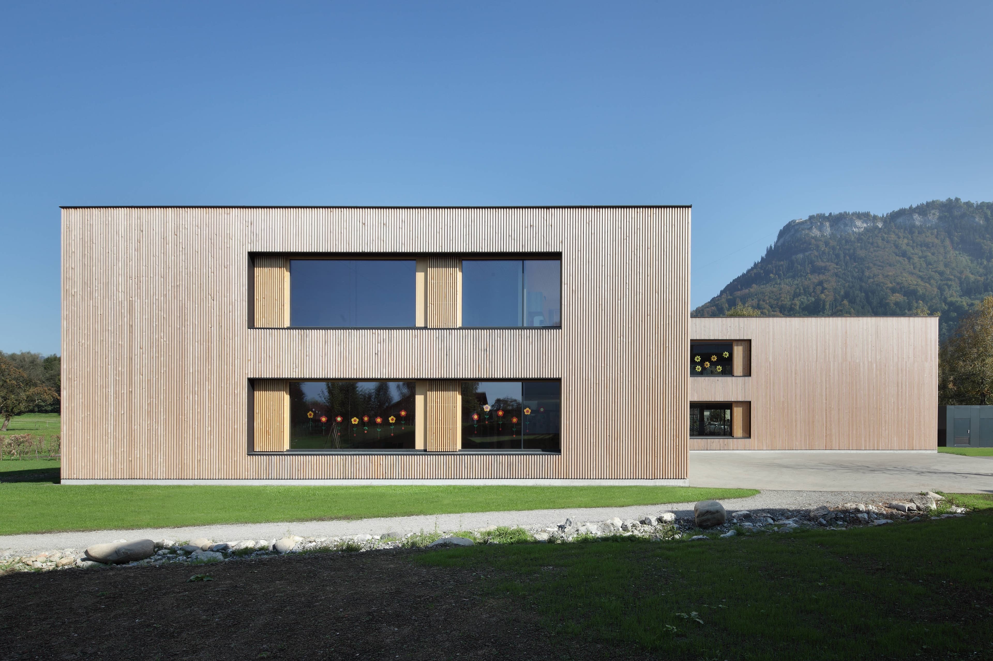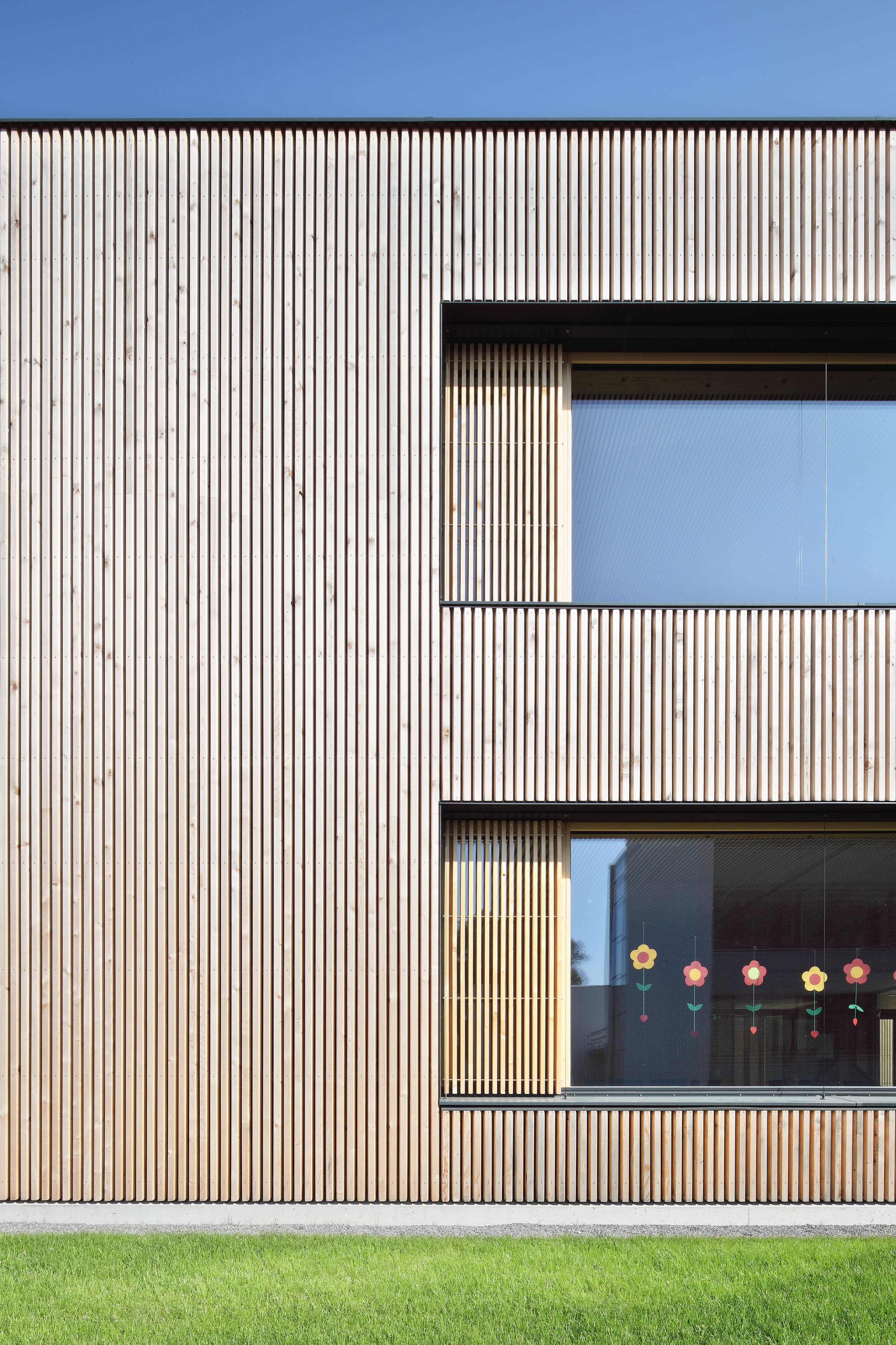 Den zweigeschossigen Kindergarten betritt man über den eingezogenen Eingangsbereich, an dem unmittelbar die vertikale Erschließung angebunden ist. An diesem zentralen Knotenpunkt ist der Gruppentrakt mit dem Allgemeinbereich (Bewegung, Essen, Personal) verbunden.