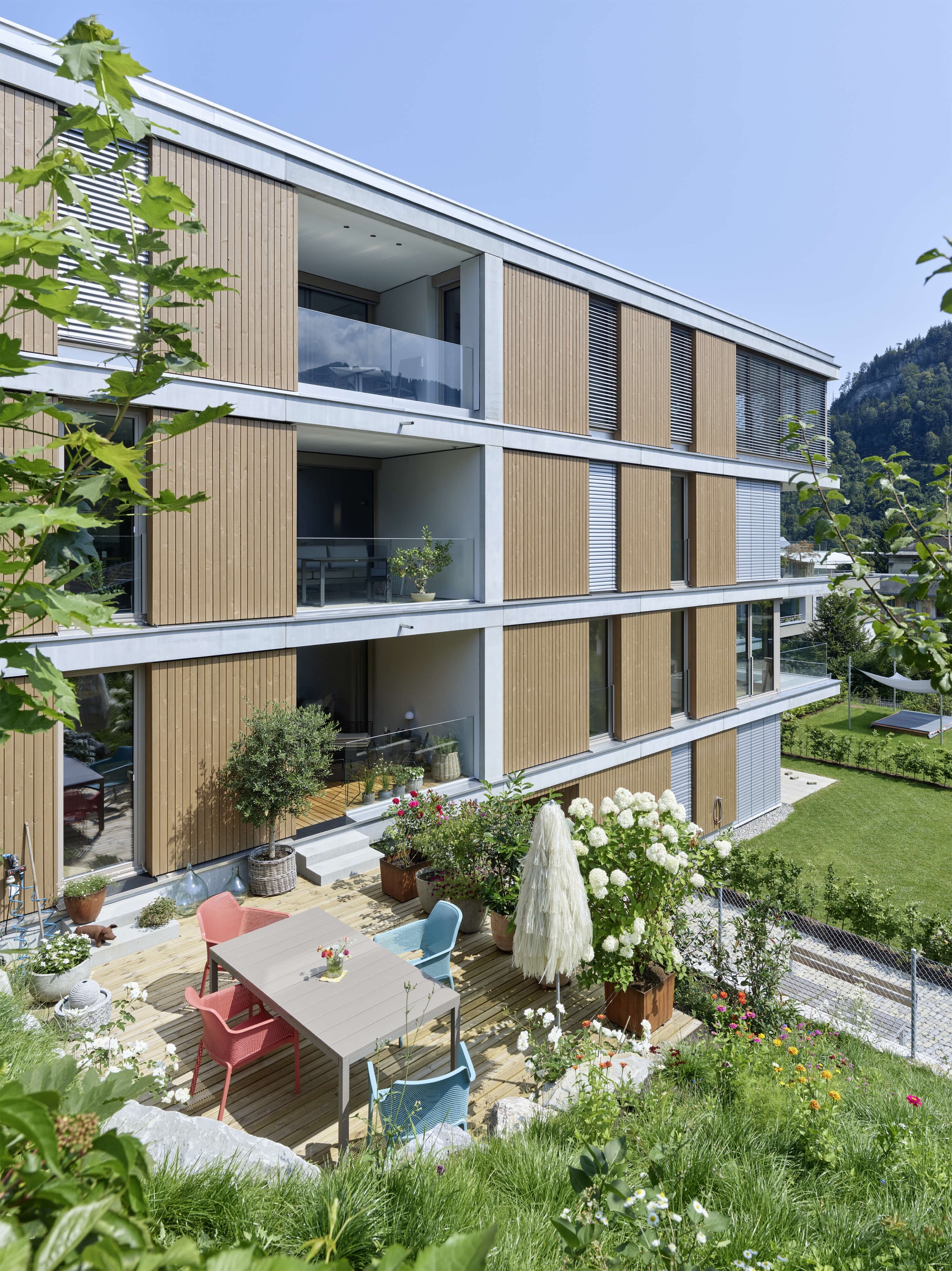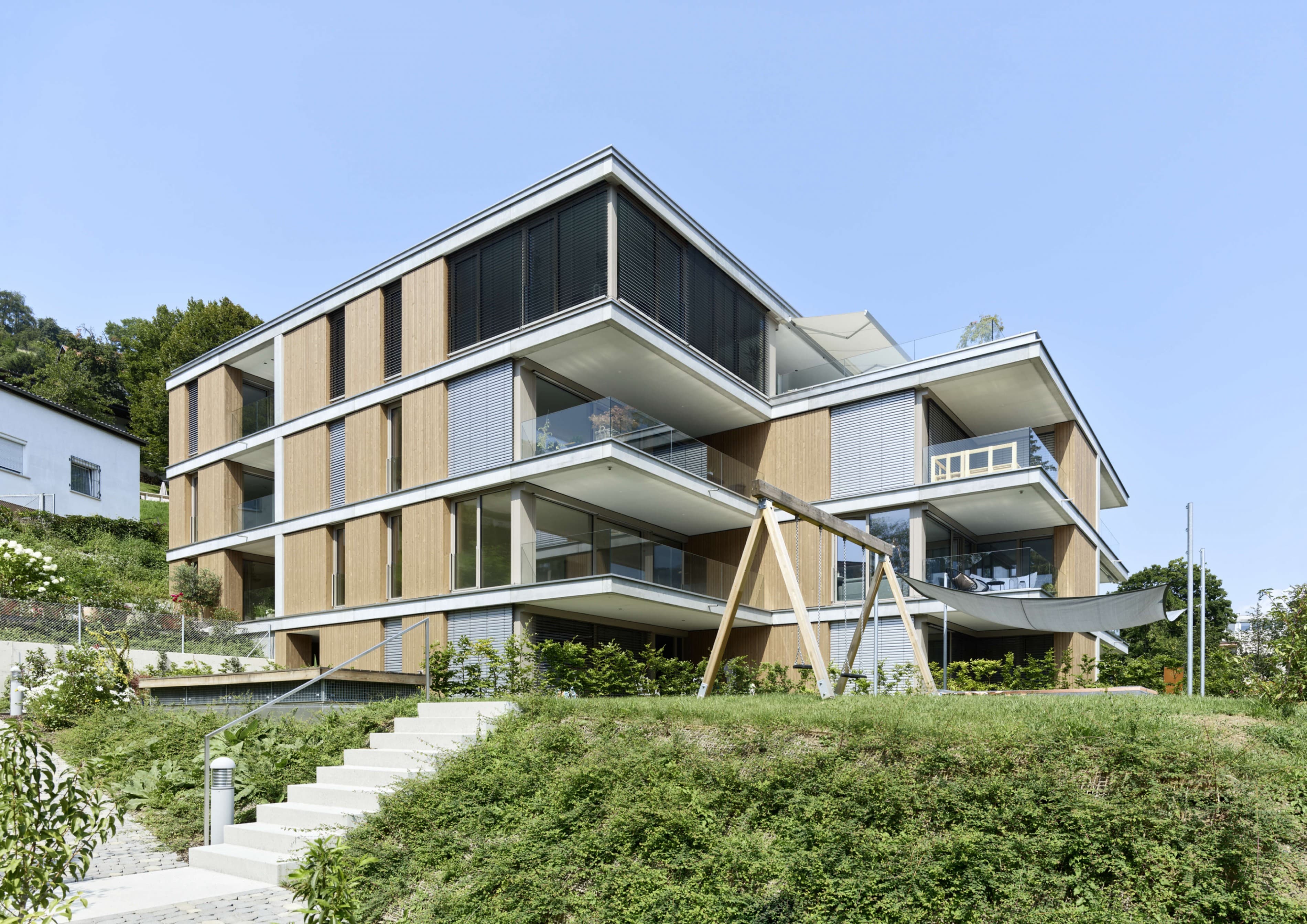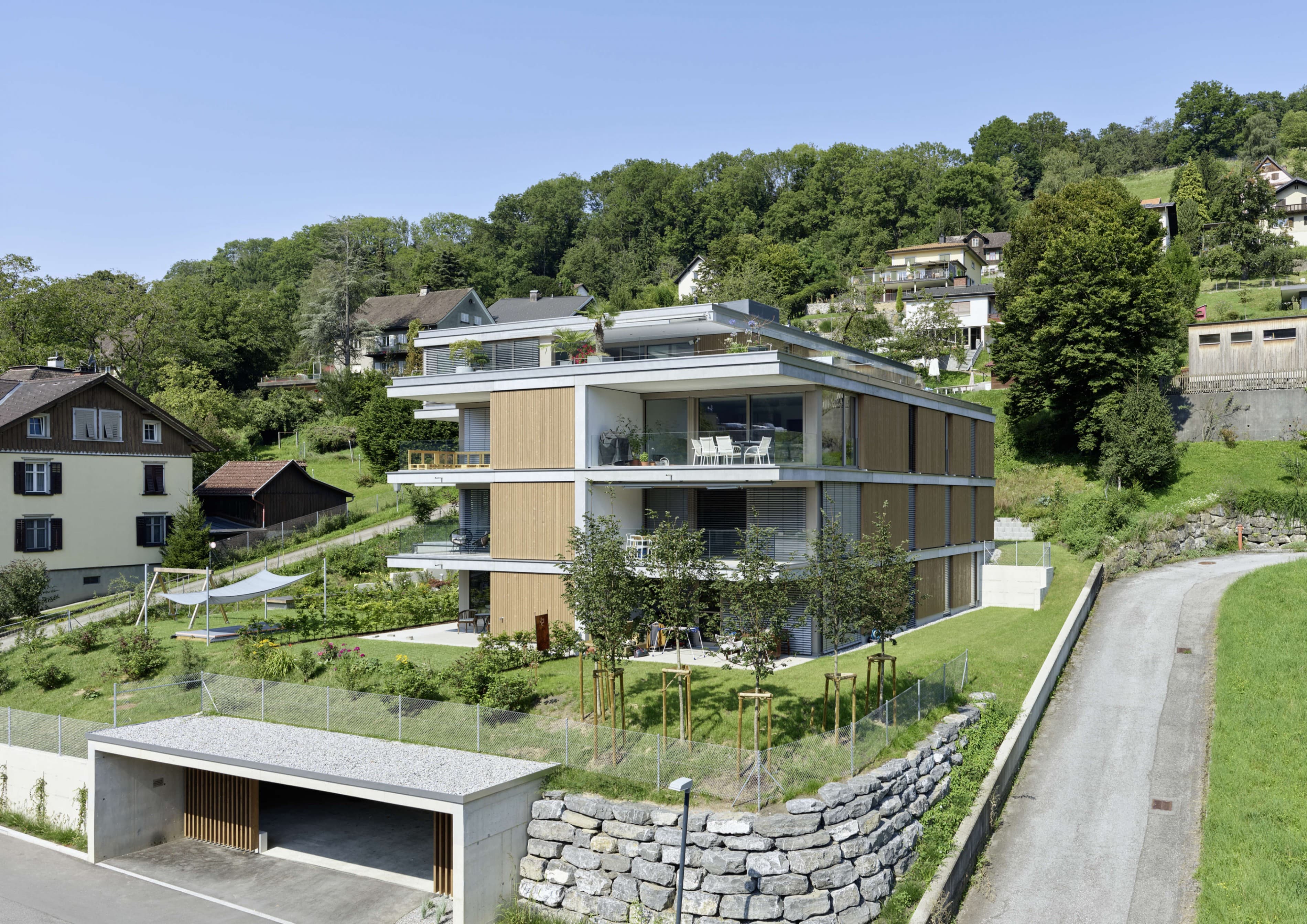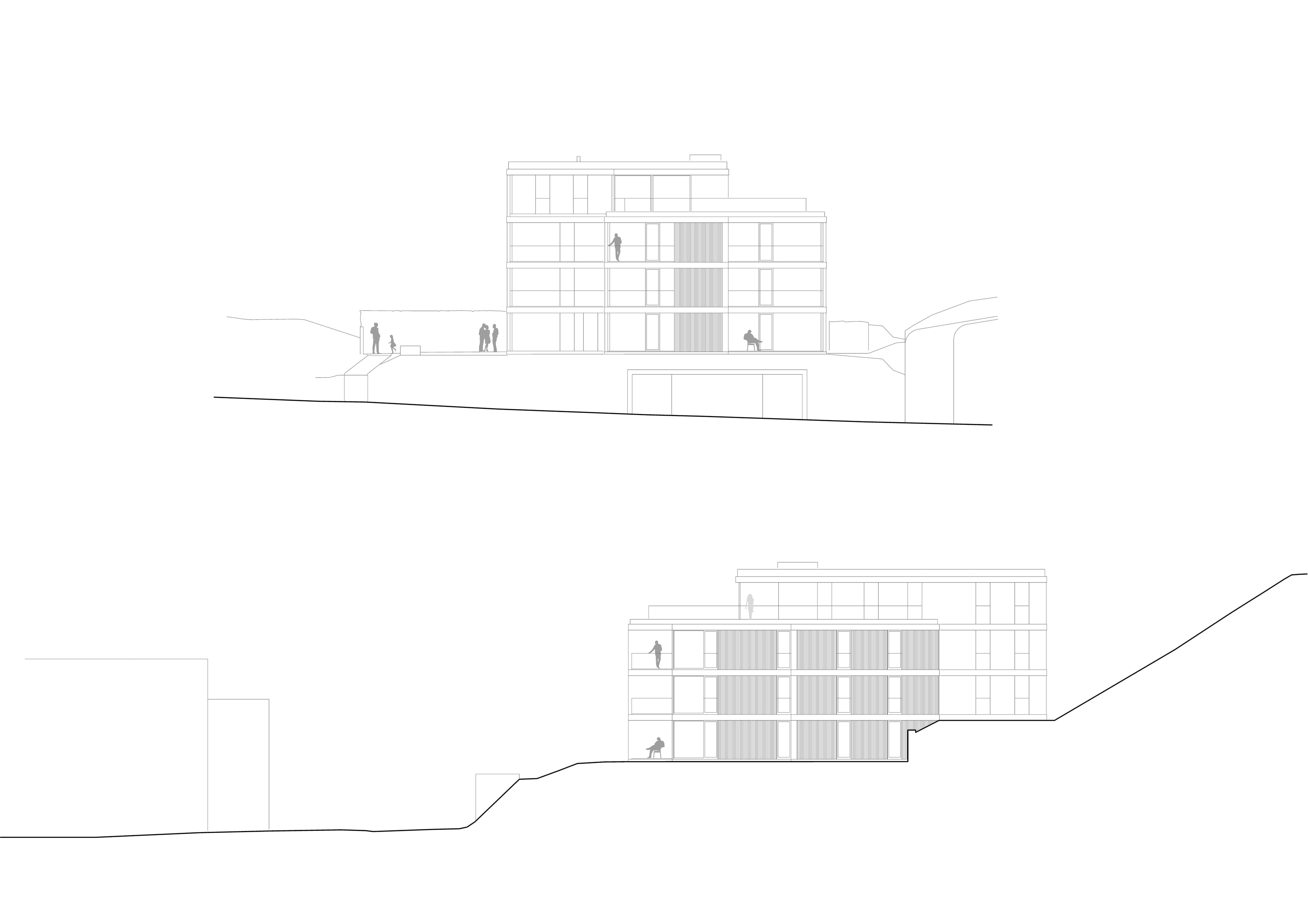 Als Antwort auf die bestehende Umgebung fügt sich ein gegliederter Baukörper in den Hang, der im Besonderen auf Topographie und Körnung der Umgebung reagiert. Dabei verbinden sich zwei wohlproportionierte und in der Höhe gestaffelte Kuben zu einem ortsverträglichen Baukörper zusammen. Dieser tritt auf Grund der Hanglage drei- bzw. viergeschossig in Erscheinung.