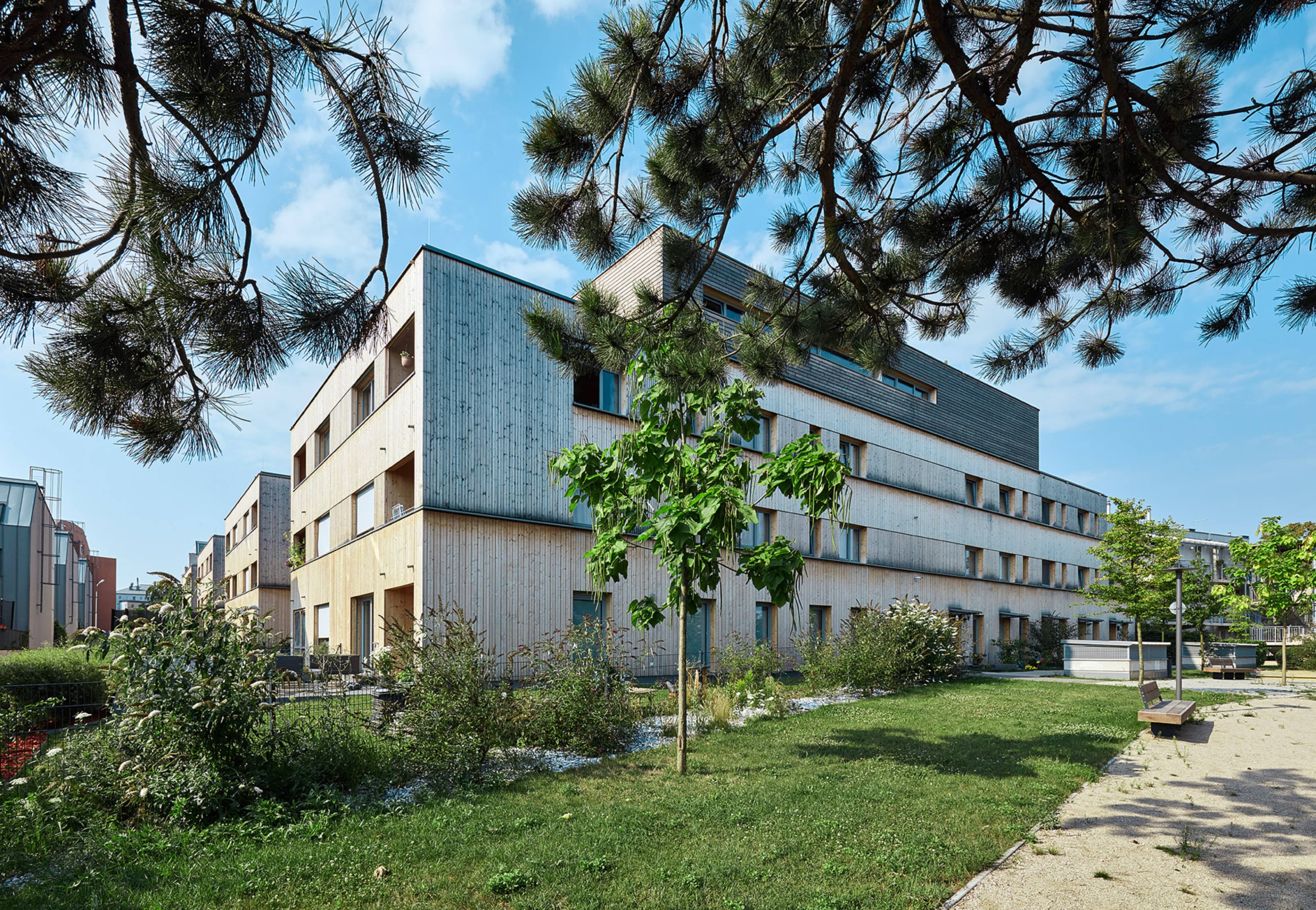 Die städtebauliche Struktur des Gebietes ist geprägt von zeilenartigen Bebauungen. Die vier Häuser nehmen dieses Thema auf und führen es weiter. Den Erdgeschosswohnungen sind Gärten vorgelagert, welche den halböffentlichen vom privaten Raum trennen. Dadurch entstehen in der Erdgeschosszone offene Kommunikationsräume und ein differenzierter, geschichteter Übergang zwischen dem öffentlichen Raum bis hin zur privaten Wohnung. Holz als Bauelement bleibt bewusst im Innen- als auch Außenbereich sichtbar. Dies schafft neben den ökonomischen und ökologischen Vorteilen eine angenehme Wohnatmosphäre und macht den Grundbaustoff sichtbar.