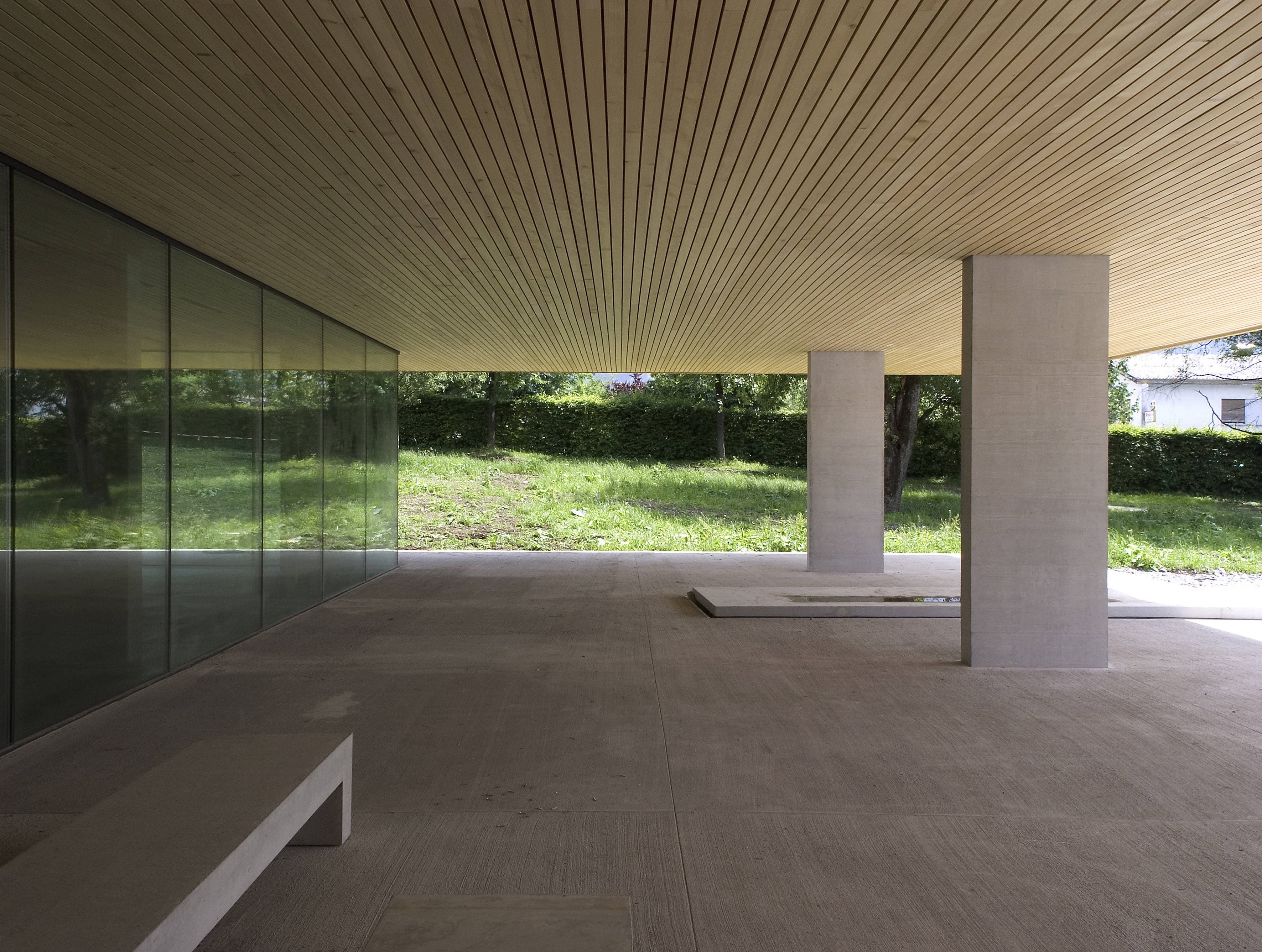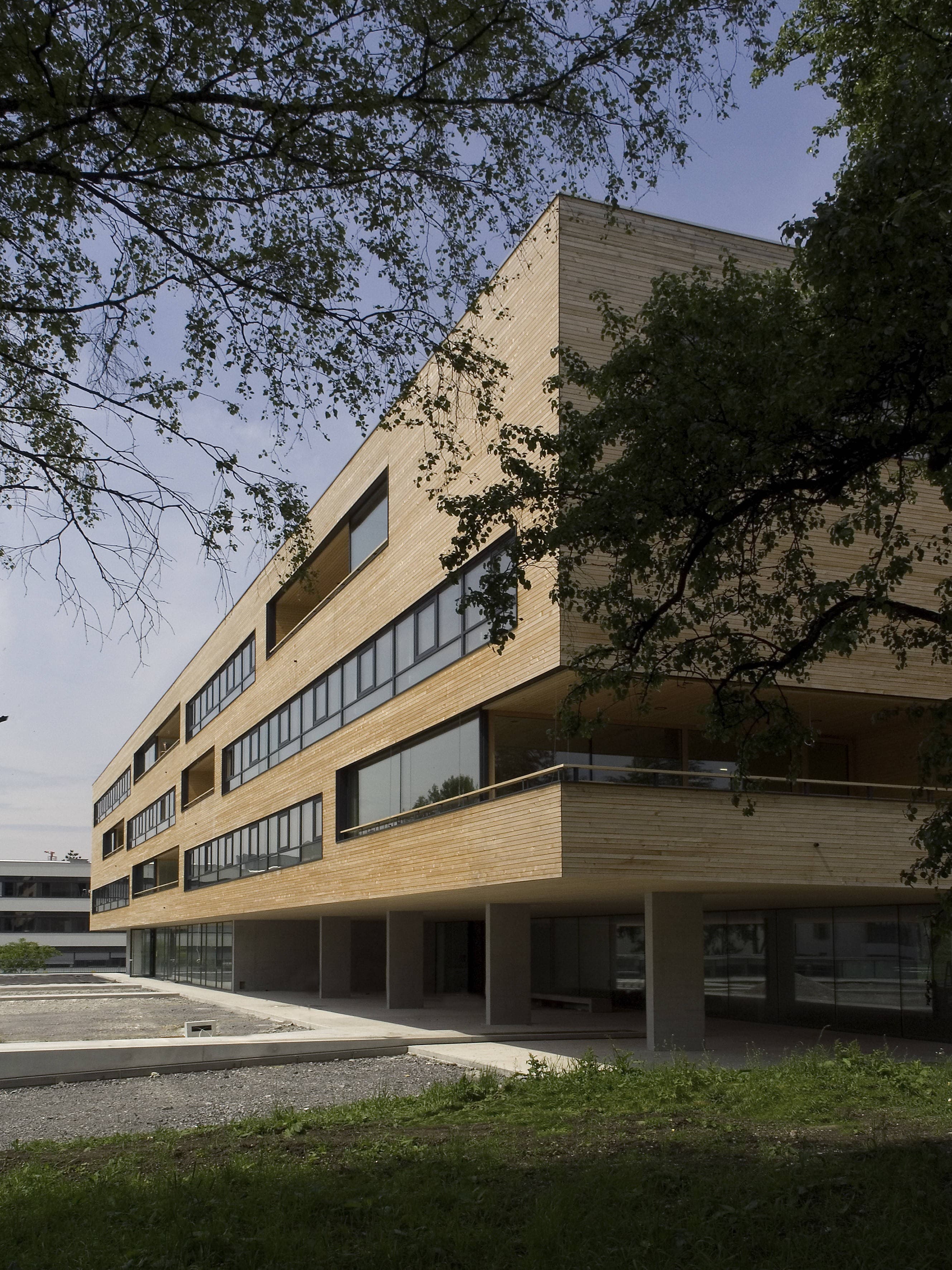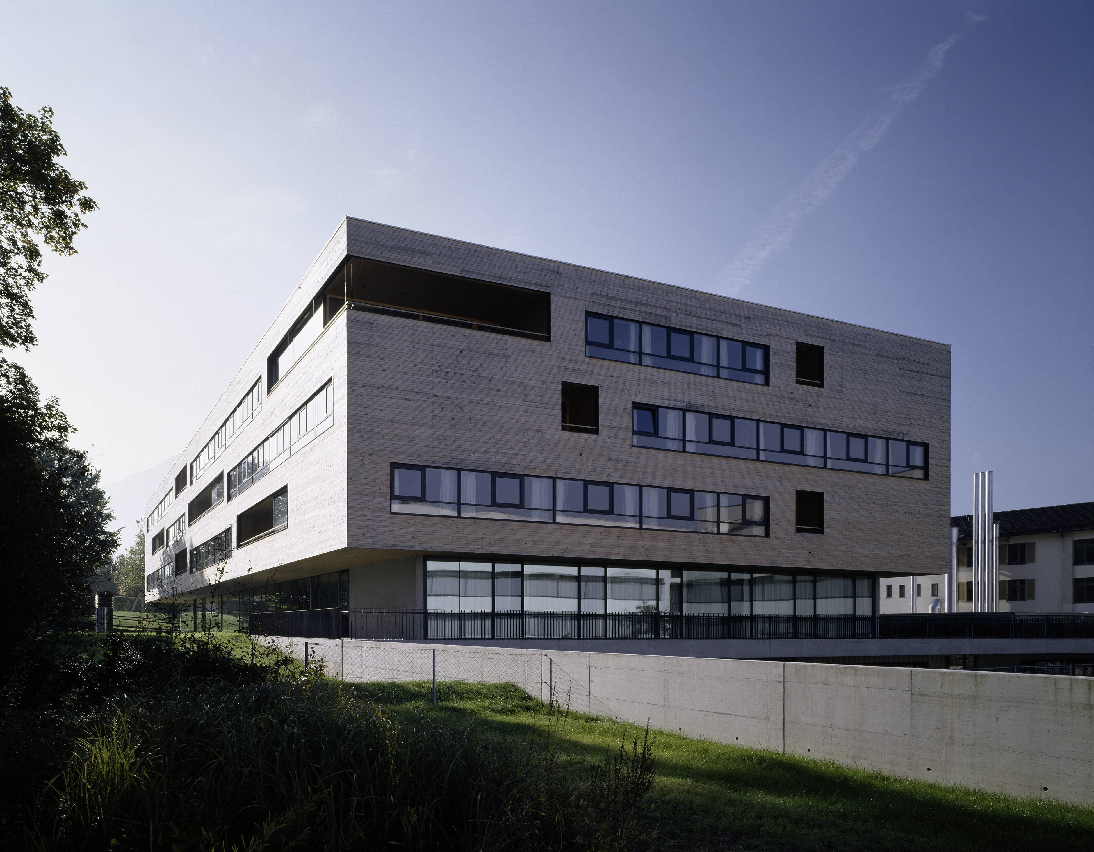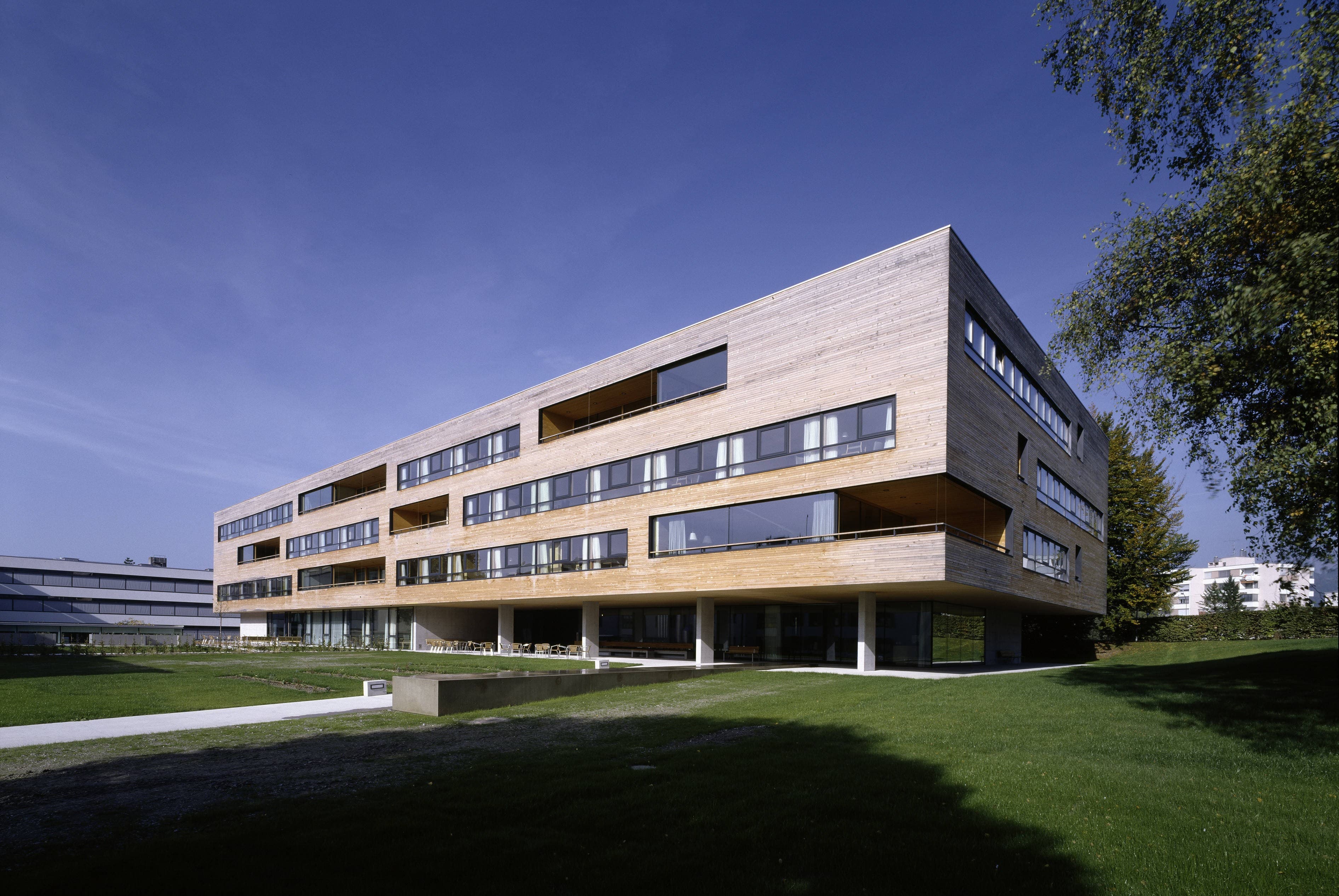 Pflegeheim mit 107 Zimmern, in einem parkähnlichen Grünraum entlang der Dornbirner Ache. Auf einem gläsernen Erdgeschoss (Eingang, Verwaltung, Kapelle, Mehrzweckräume und Dementenstation) schwebt ein dreigeschossiger Holzkubus. Die eingezogenen Loggien der versetzt angeordneten Aufenthaltsräume bilden tiefe Kerben, die sich mit den außen bündig liegenden Fensterbändern der Zimmer abwechseln.