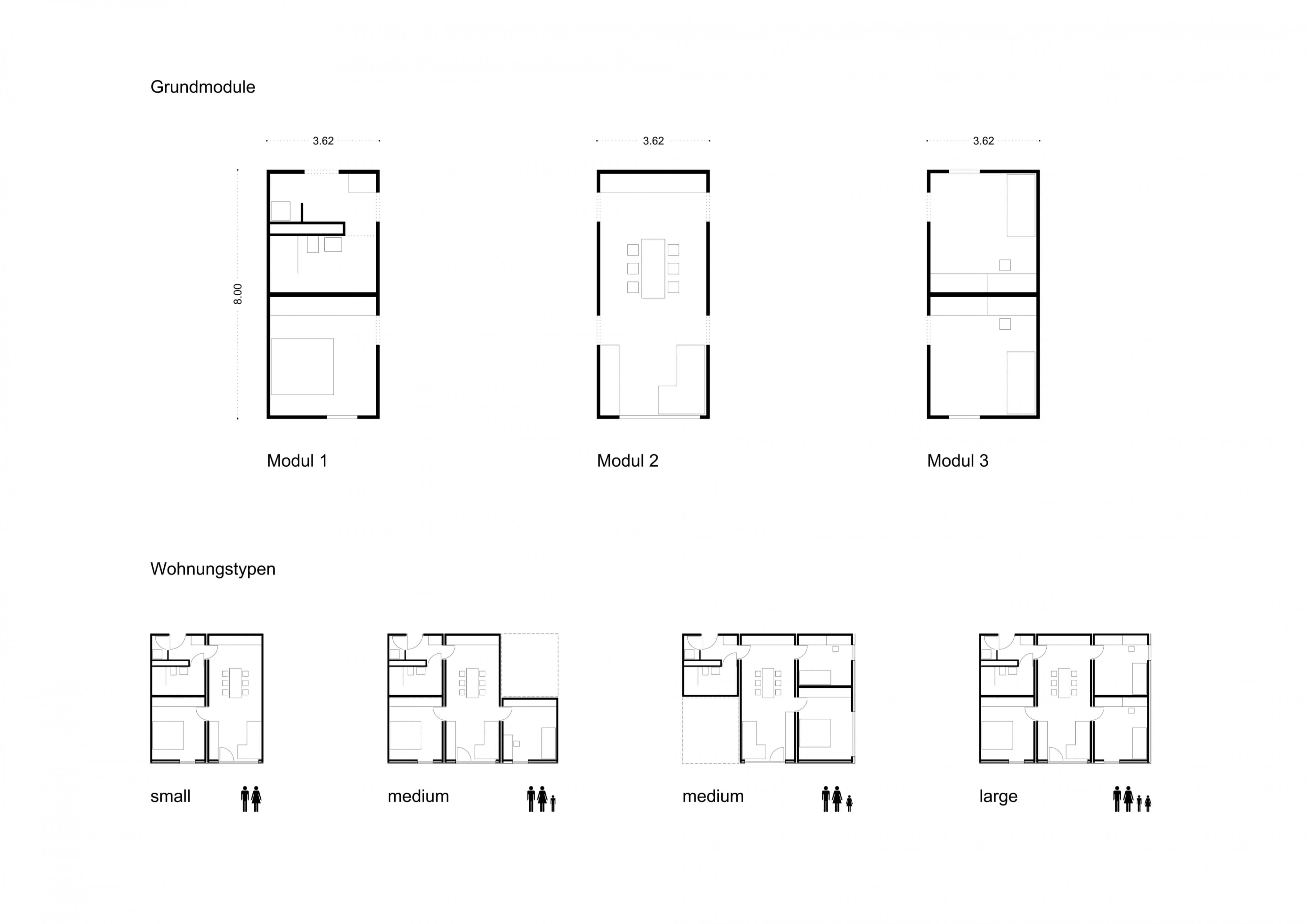Seriell vorgefertigte, komplette Raummodule aus Massivholz werden nach dem Prinzip „Plug & Play“ zu multifunktionalen, flexiblen Wohneinheiten kombiniert. Aus drei unterschiedlichen Grundmodulen lassen sich sämtliche Grundrisstypen und Wohnungsgrößen bauen.