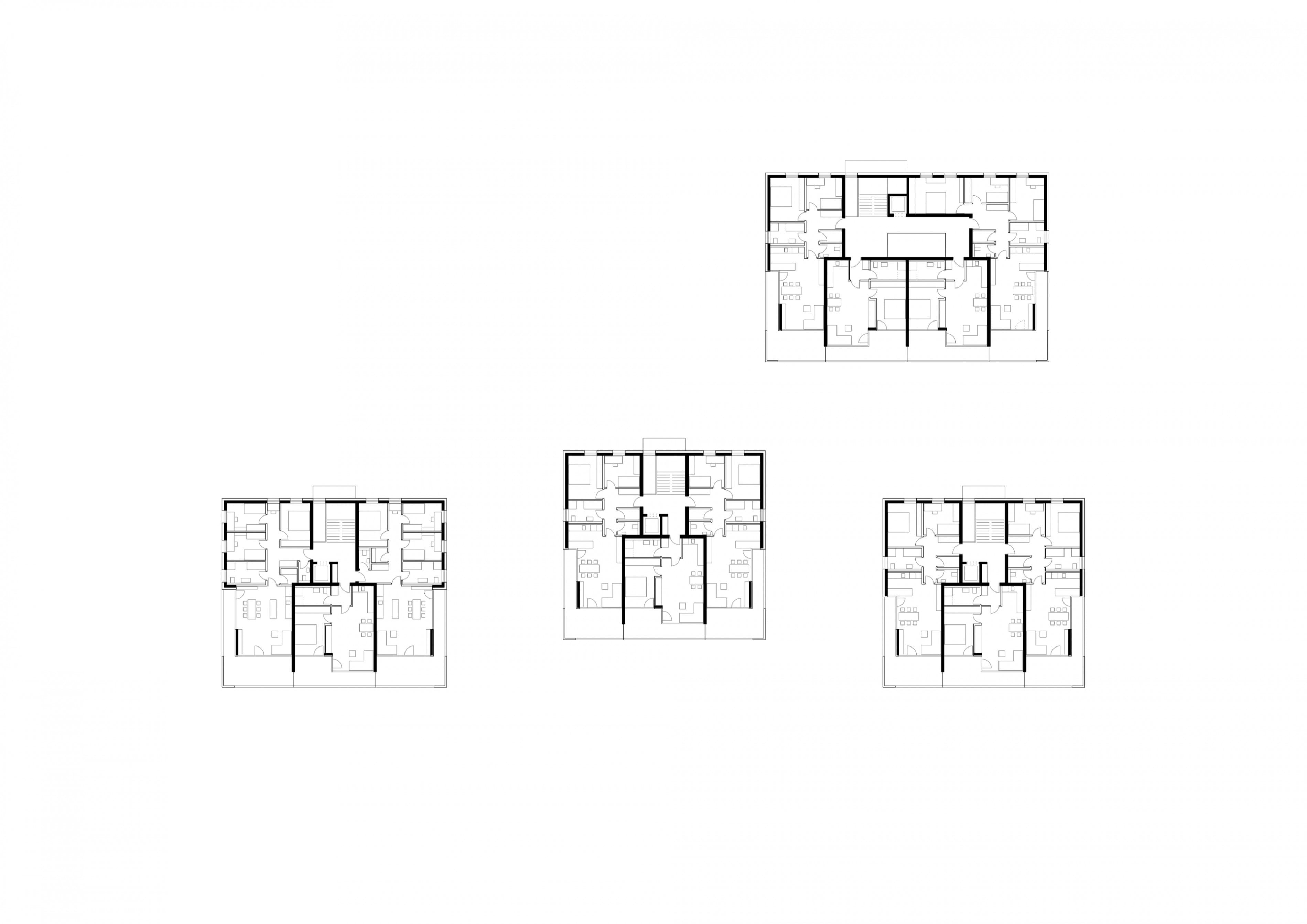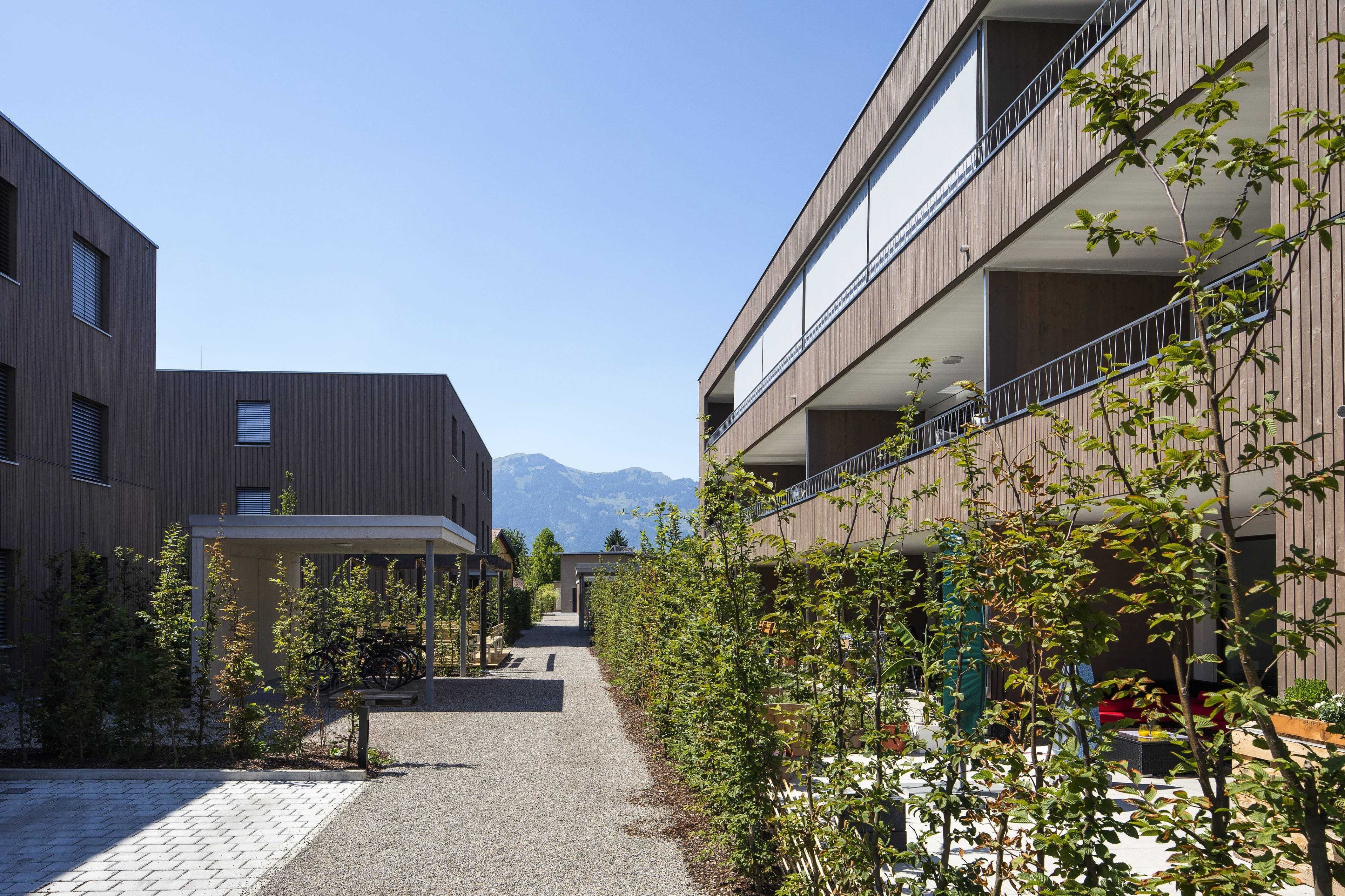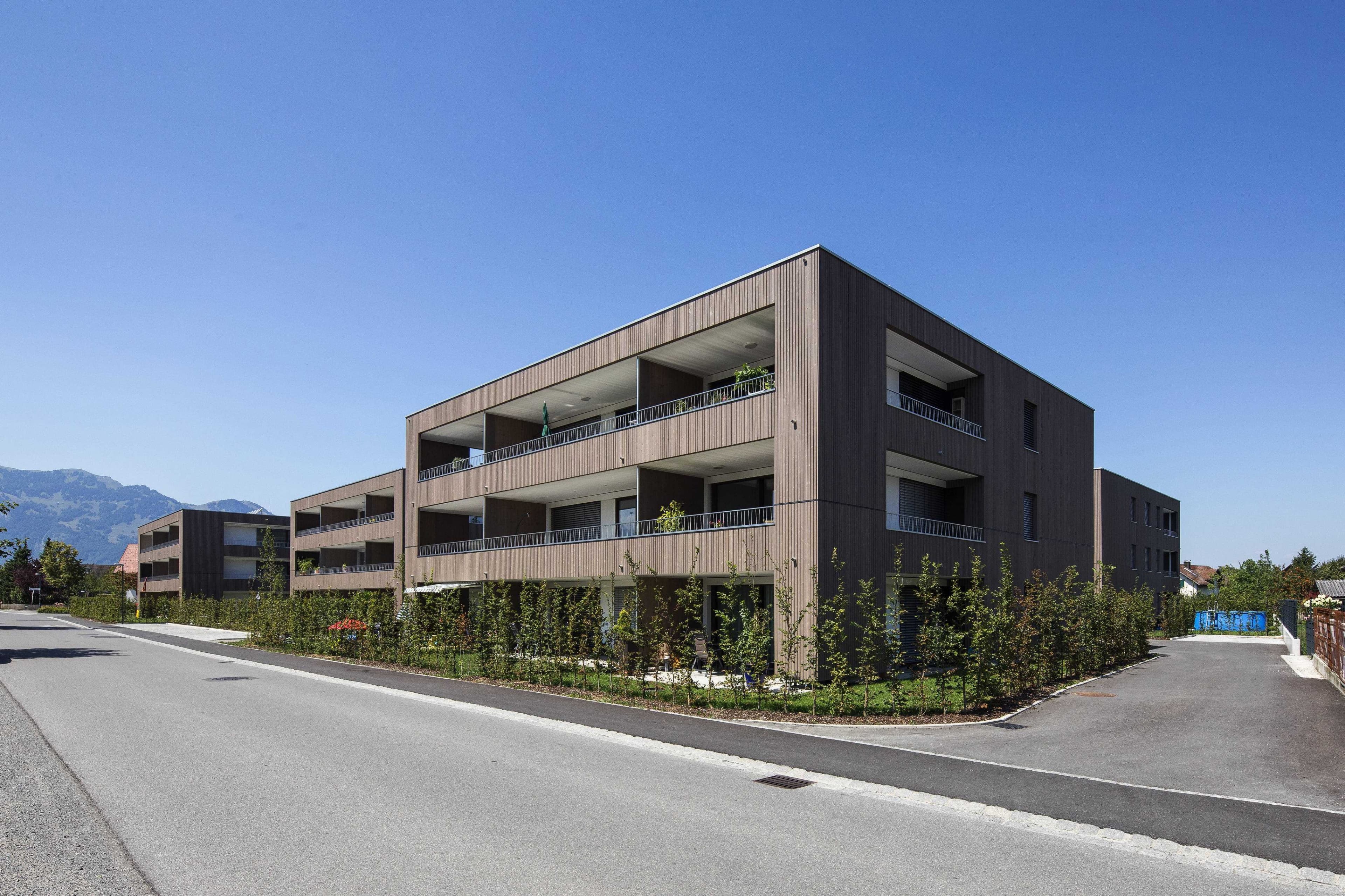 Die vier Baukörper liegen in zentraler und doch ruhiger, ländlicher Lage. Sie sind in ihrer Körnung der angrenzenden und vorherrschenden Einfamilienhausbebauung ein angepasstes Gegenüber. Mit fast siedlungsartigem Charakter, durch gleiche Gebäudetypen suggeriert, ergänzt die Bebauung das nachbarschaftliche Gefüge entgegenkommend. Vor allem im Zusammenspiel mit der hochwertigen Außenraumgestaltung, die nachbarschaftliche Grünflächen einbezieht, wird die Wohnqualität spürbar.