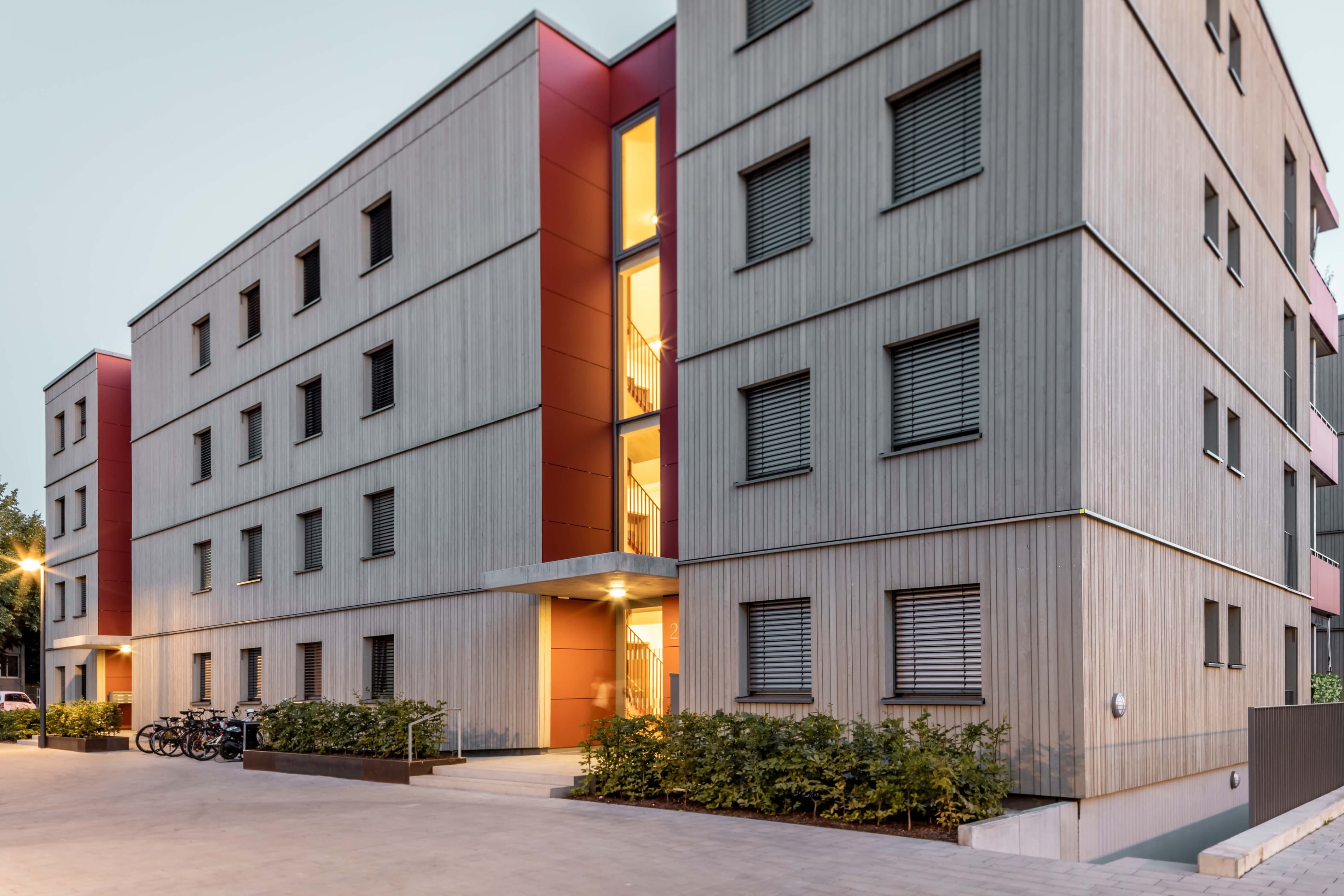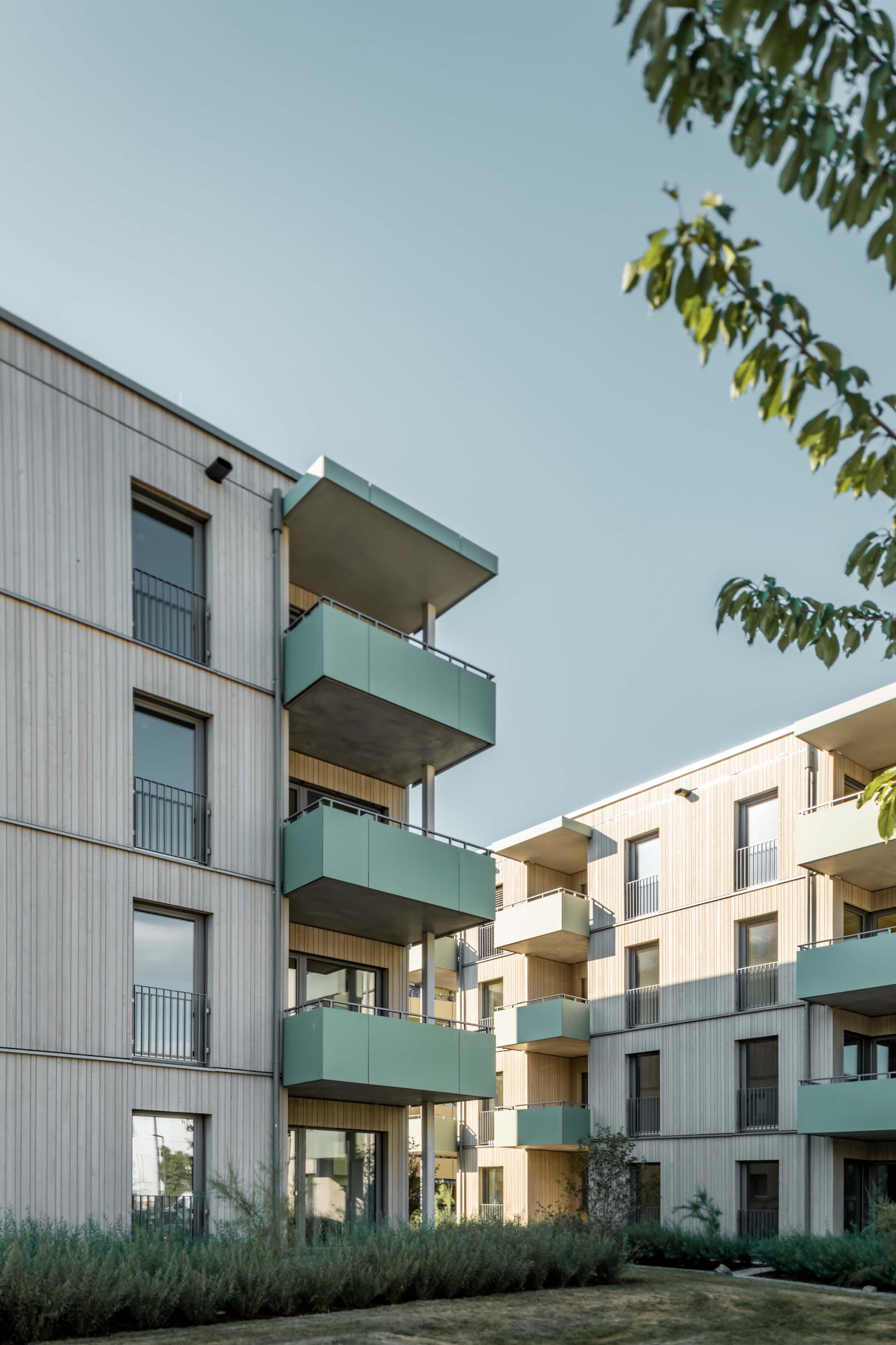 Um ein vielfältiges Wohnungsangebot zu ermöglichen, sind 3 Gebäudepaare als reine Holzbauten konzipiert. Zwei rechtwinkelig zueinanderstehende Gebäude bilden immer ein Paar mit differenzierten Wohnungsgrundrissen. Jedes dieser Gebäude ist mit einem Treppenhaus erschlossen und hat 4 exakt gleiche Regelgeschosse, was speziell beim Holzbau zu empfehlen ist. Nach intensiver Kostenbetrachtung ist dann die Wahl auf einen reinen Holzbau gefallen.