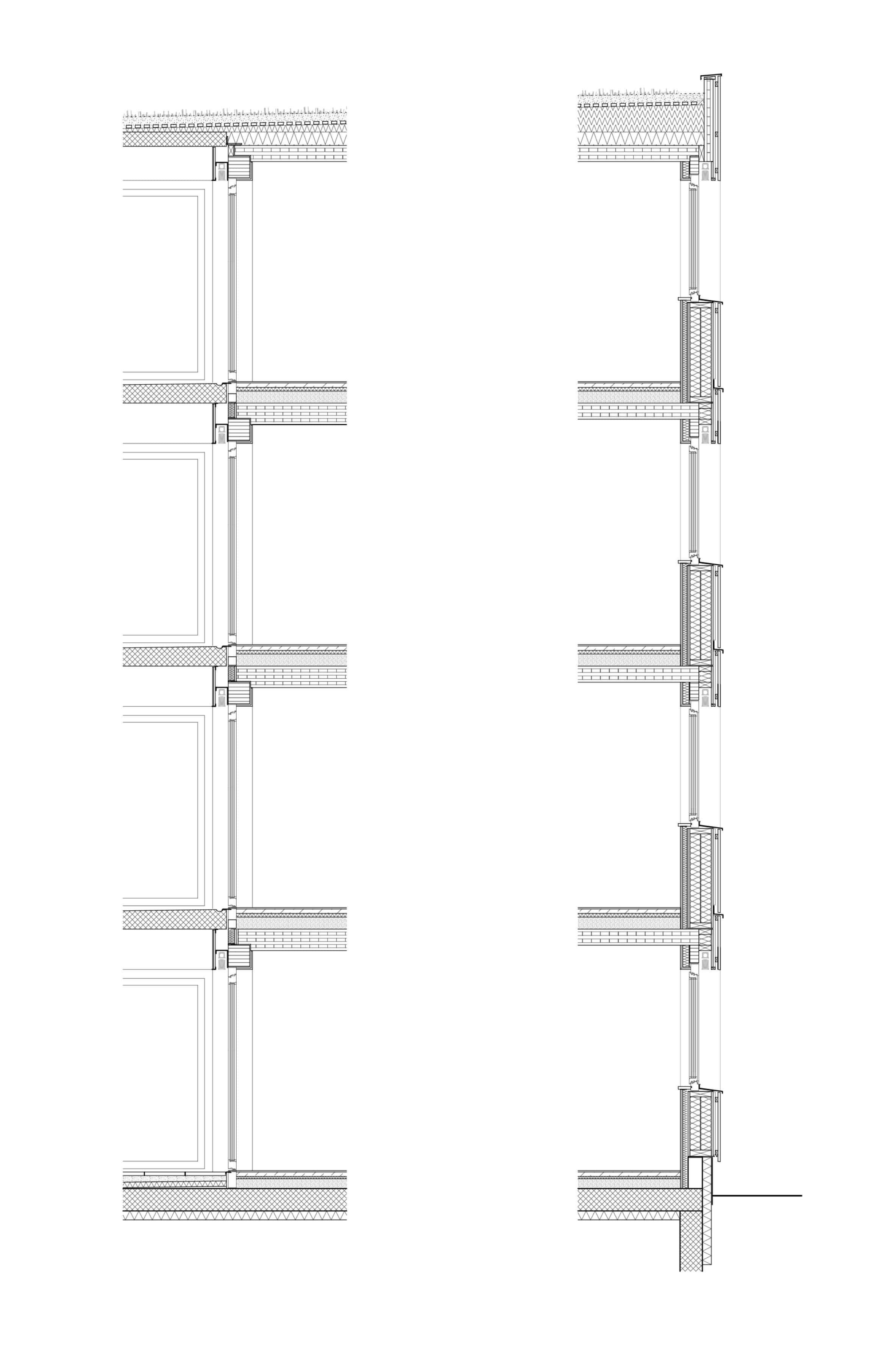 Die Hauptelemente sind lastabtragende Holzrahmen-Außenwände, Brettsperrholz für Treppenraum, Liftschacht und Geschoßdecken sowie je Gebäudeteil eine lastabtragende Innenwand in Längsrichtung. Sämtliche nicht lastabtragenden Innenwände sind in Trockenbauweise kostengünstig ergänzt worden. Durch diese Konstruktion sind die Holzbauteile mit einem hohen Vorfertigungsgrad und gleichen Formaten einsetzbar, was Kosten und Bauzeit spart. Durch den Einsatz von Brettsperrholz für das Treppenhaus und den Liftschacht sind Montage, Toleranzen und Genauigkeit in einem Gewerk gebunden und erzeugen keine zusätzliche Schnittstelle. Der Zimmermann ist für den Rohbau des gesamten Gebäudes zuständig und verantwortlich, er setzt auch die Fertigteil-Betontreppenläufe des Treppenhauses. Im Inneren sind nur die Decken als Holzoberfläche sichtbar. Um den Schallschutz auf hohem Niveau zu gewährleisten, wird darauf geachtet, dass die Decken durch das Trennen an der Wohnungstrennwand keine wohnungsübergreifenden Schallbrücken erzeugen – die Decken sind mit 15 cm ungebundener Kiesschüttung beschwert. Das äußere Kleid bildet eine hinterlüftete, vorvergraute Wechselfalz-Fichtenfassade.