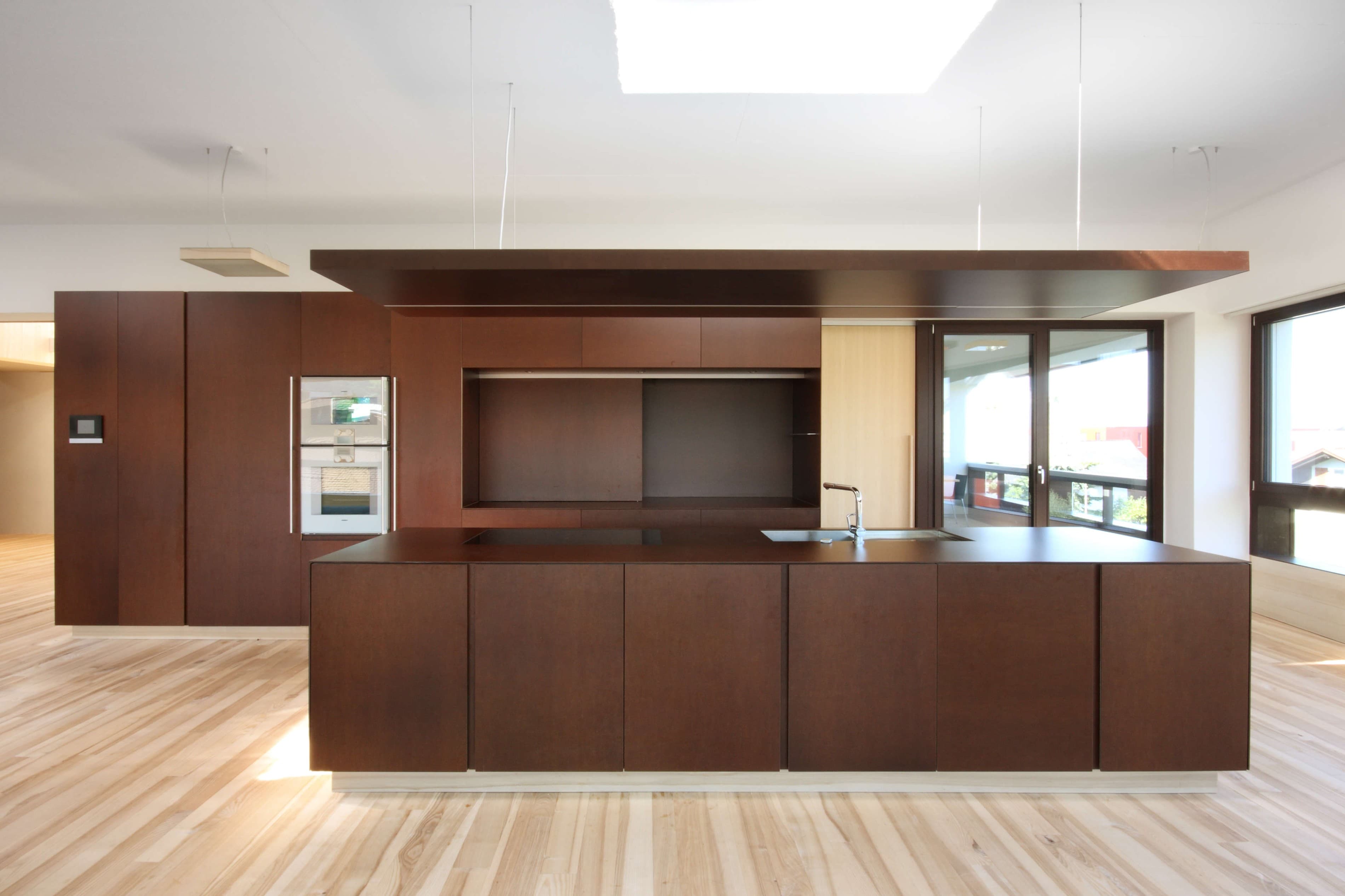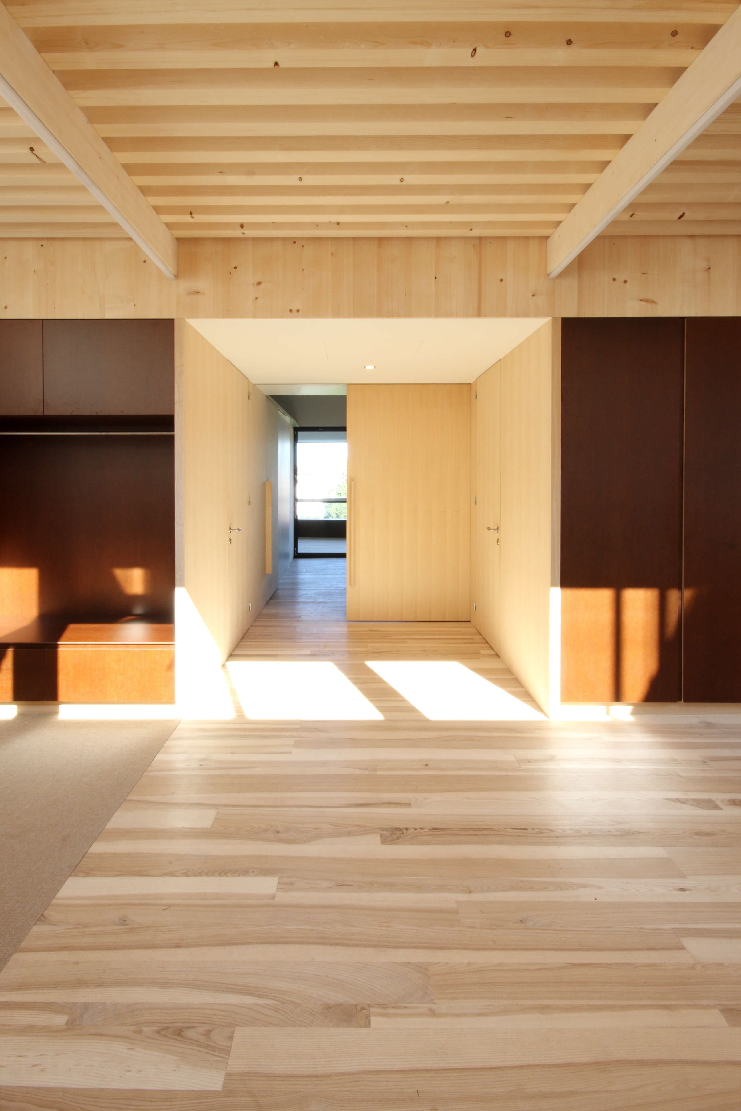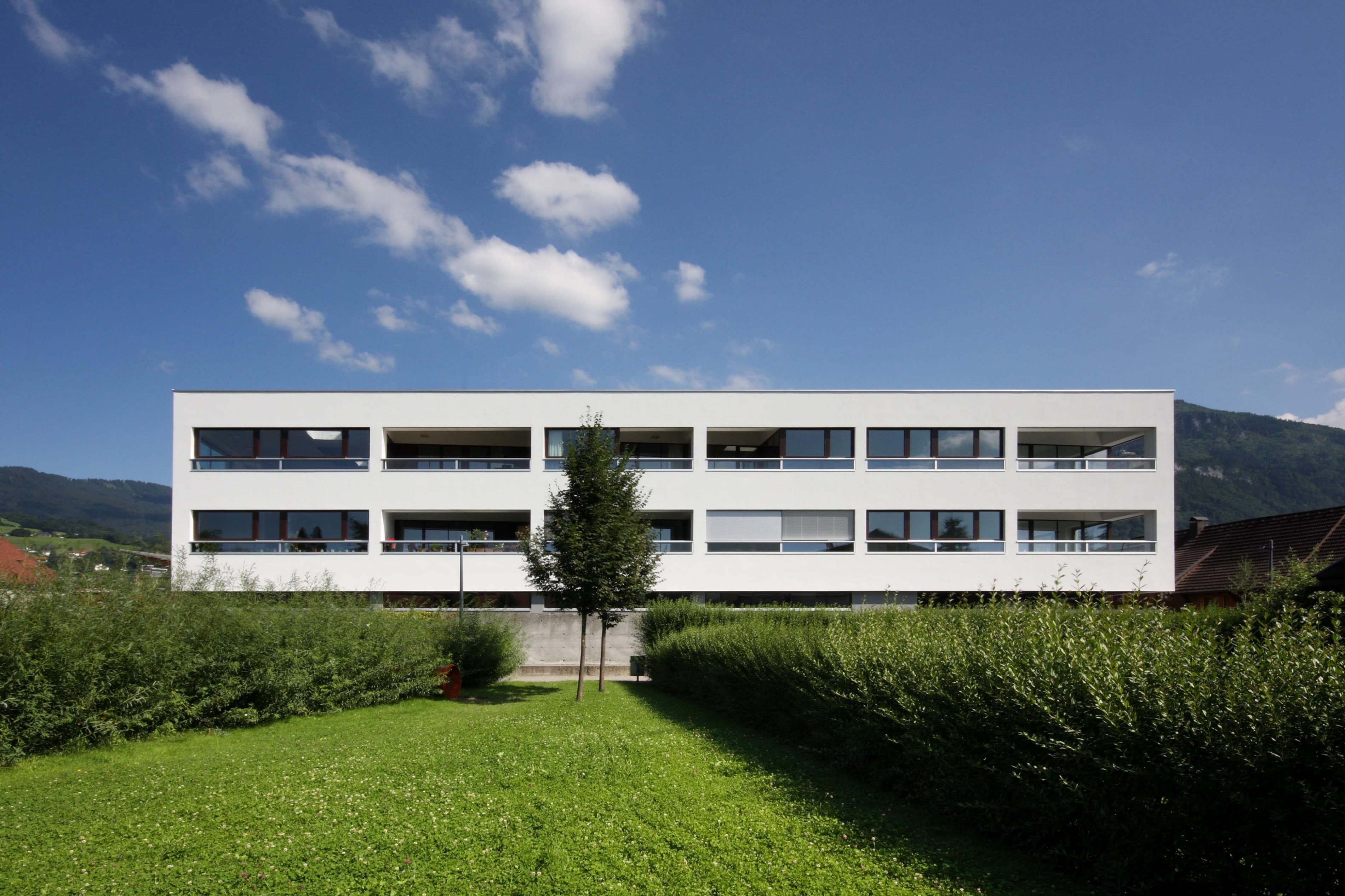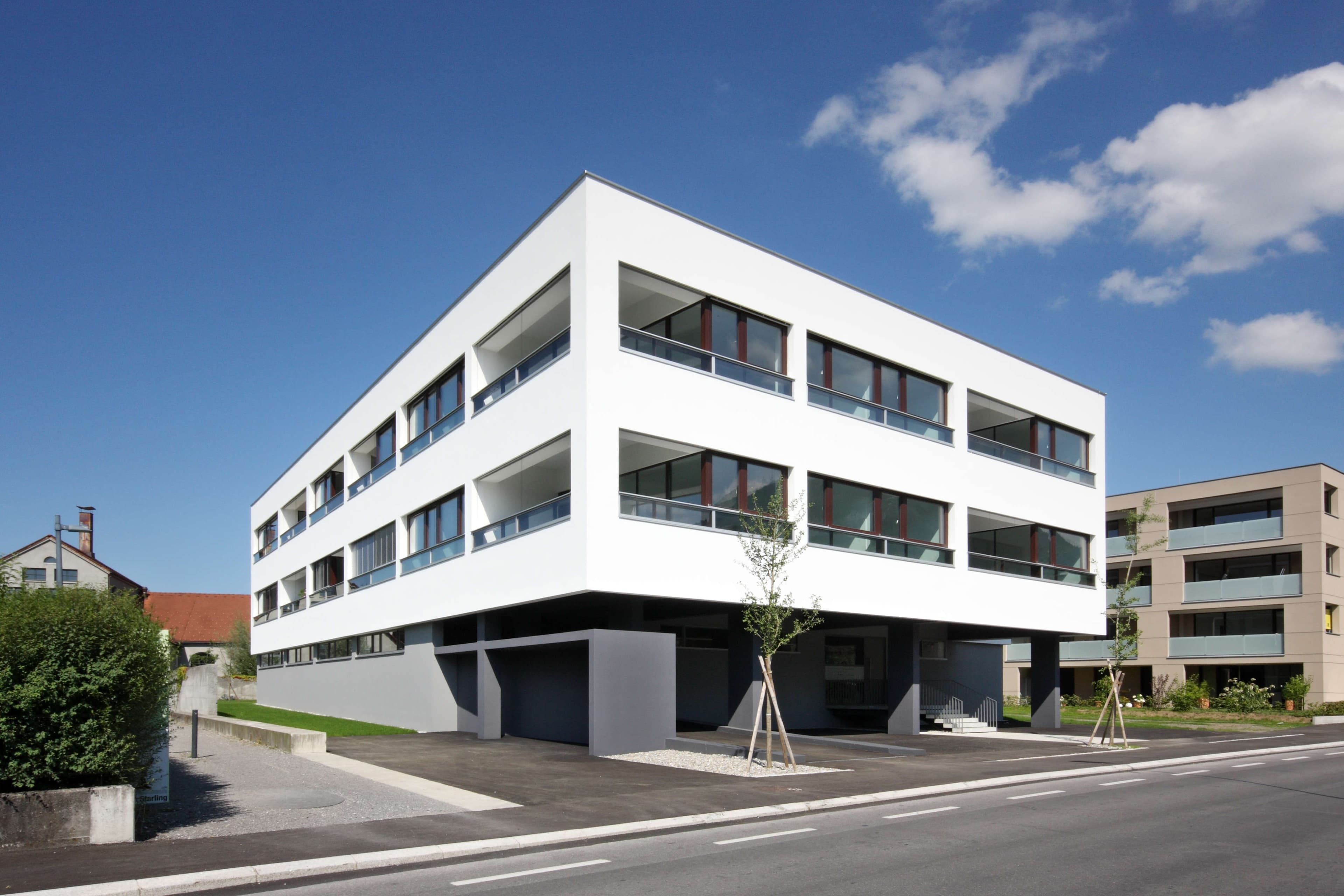 Der kompakte Baukörper, die hoch gedämmte Außenhaut mit 3-fach-verglasten Fenstern und eine luftdichte und wärmebrückenfreie Hülle machen den Einsatz einer Komfortlüftung mit Wärmerückgewinnung und Erdsonden zur Wärmegewinnung fast selbstverständlich. Auf den Eingangsbereich, die Parkgarage und Lagerräume im Erdgeschoss wurden die Wohnungen aufgesetzt.