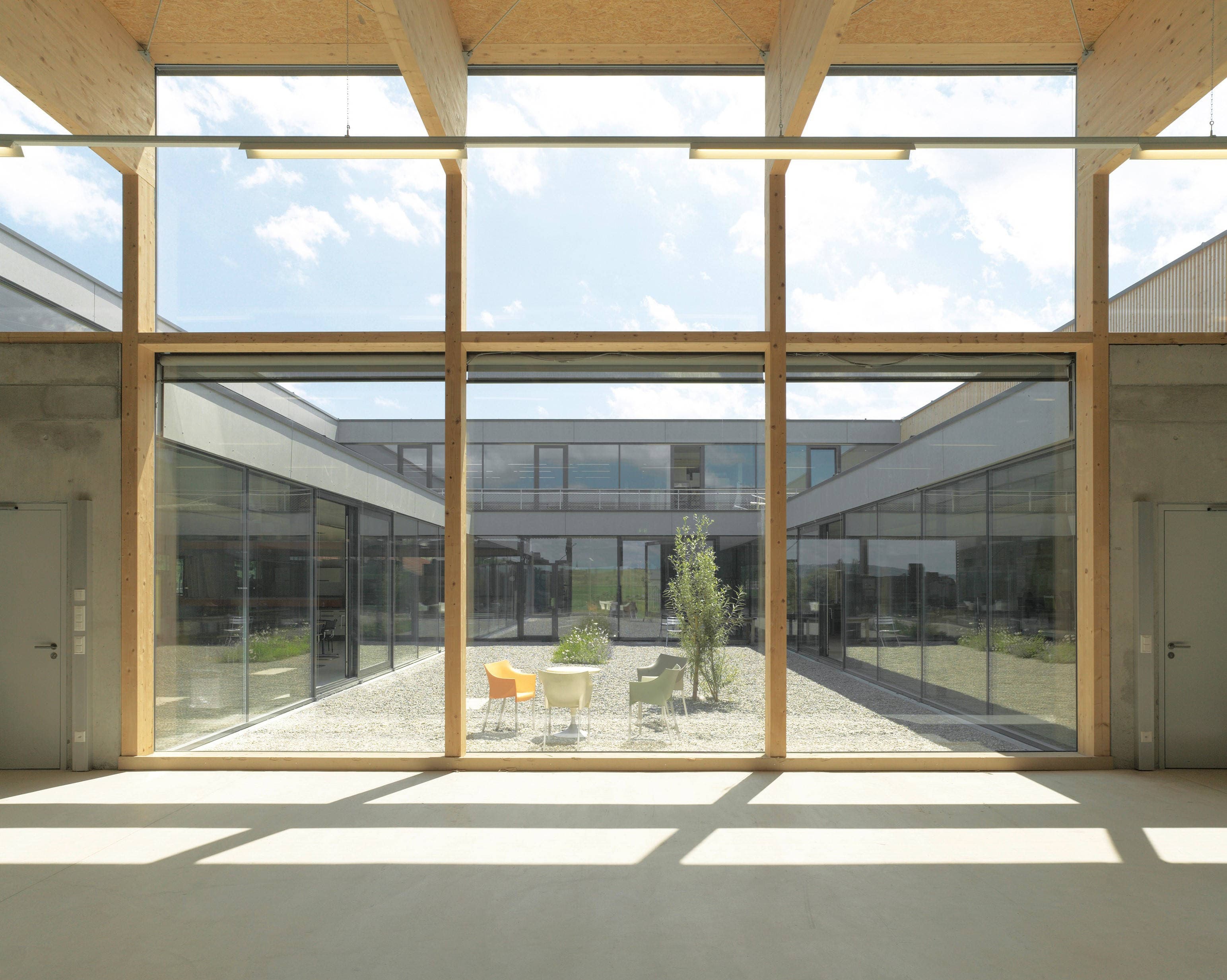 Die Bürozone ist zum Innenhof vollständig und Produktion hin teilweise verglast. Die umlaufende Produktionsfläche ist in der unteren Hälfte der Fassadenhöhe ebenfalls über weite Strecken verglast, der obere Fassadenteil ist mit Metallsandwichpaneelen ausgeführt. Die Gebäudehülle des Neubaus wurde mit einem offenen, vertikalen Holzschirm ausgeführt.