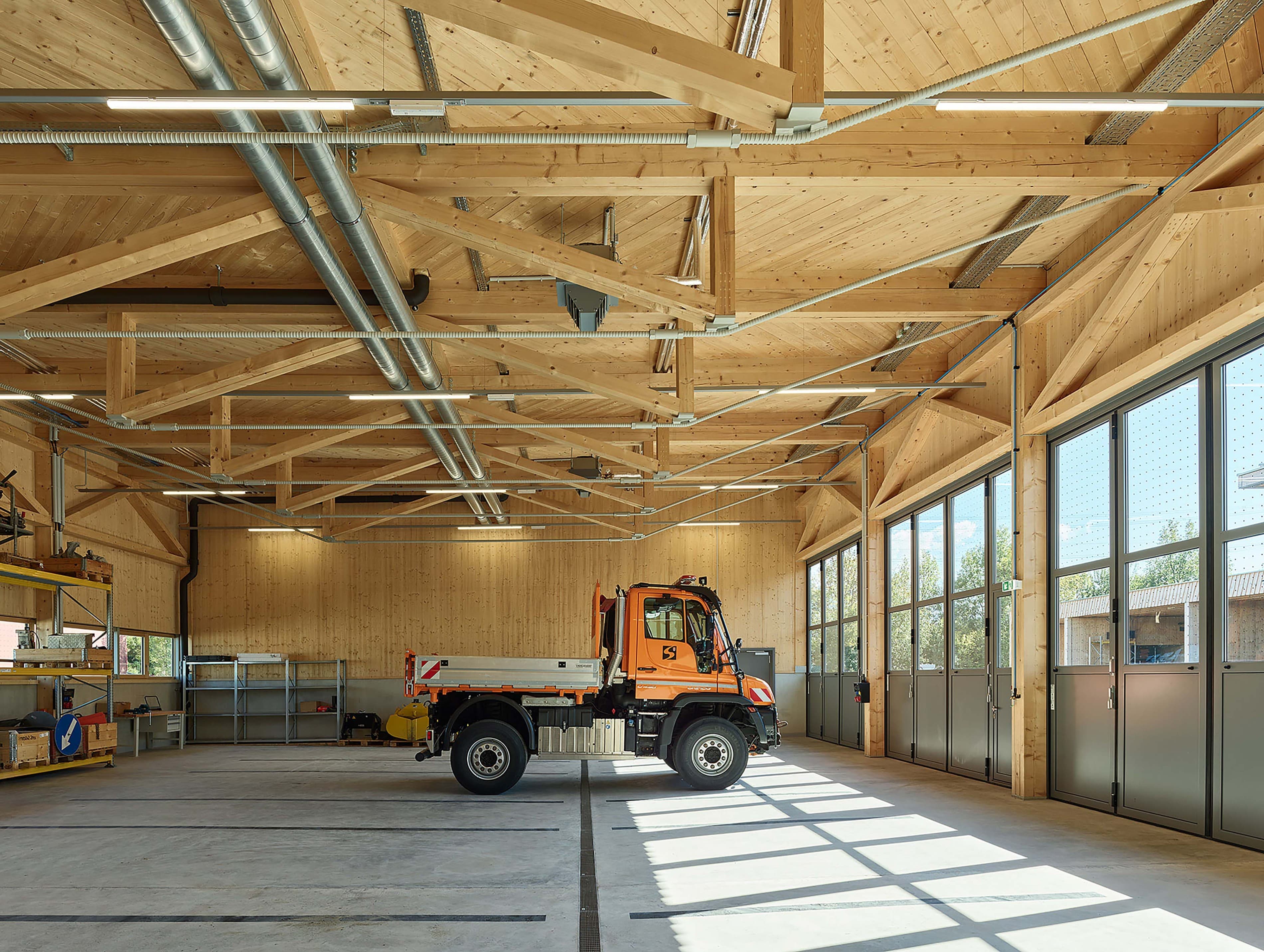 Die Anlage besteht aus zwei langgestreckten, einander gegenüberliegenden Baukörpern, zwischen denen eine zentrale Hoffläche liegt. Der geschlossene, beheizte Baukörper beherbergt Garagen, Werkstätten sowie Räume für Personal und Verwaltung. Im gegenüberliegenden Bauteil sind die Außenlagerflächen, die Tankstelle und der Waschplatz untergebracht. Die klare funktionale Trennung ermöglicht effiziente Betriebsabläufe und eine übersichtliche Organisation.