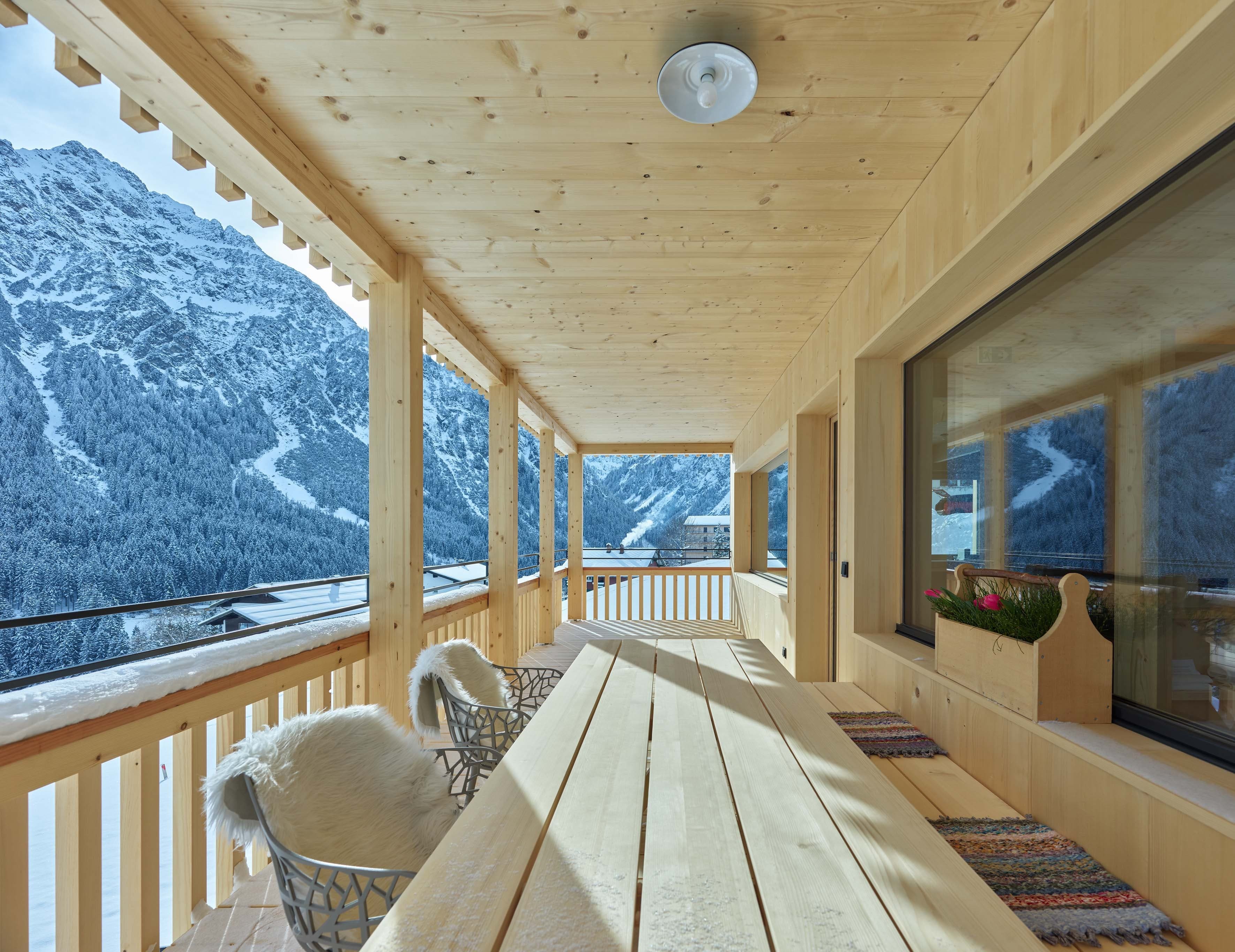 In Mittelberg (Kleinwalsertal) entstand 2022 dieses Wohn- und Apartmenthaus mit 4 Wohneinheiten und einer in das Gelände integrierten Parkgarage. Das Erdgeschoss wurde in Massivbauweise und die restlichen Geschosse (OG 1 und OG 2) in Holzmodulbauweise ausgeführt. Ein klassisches Satteldach schließt das Gebäude nach oben ab. Die Fassade besteht zum Großteil aus einer hinterlüfteten Holzverschindelung und im Bereich der Balkone aus vertikalen Holzleisten. Besonderer Wert wurde auf den Einsatz von nicht industriell hergestellten Produkten gelegt. So sind alle konstruktiven und verkleidenden Holzbauteile als Vollholz in Fichte oder Weißtanne ausgeführt, welche für Behaglichkeit und ein angenehmes Raumklima sorgen.