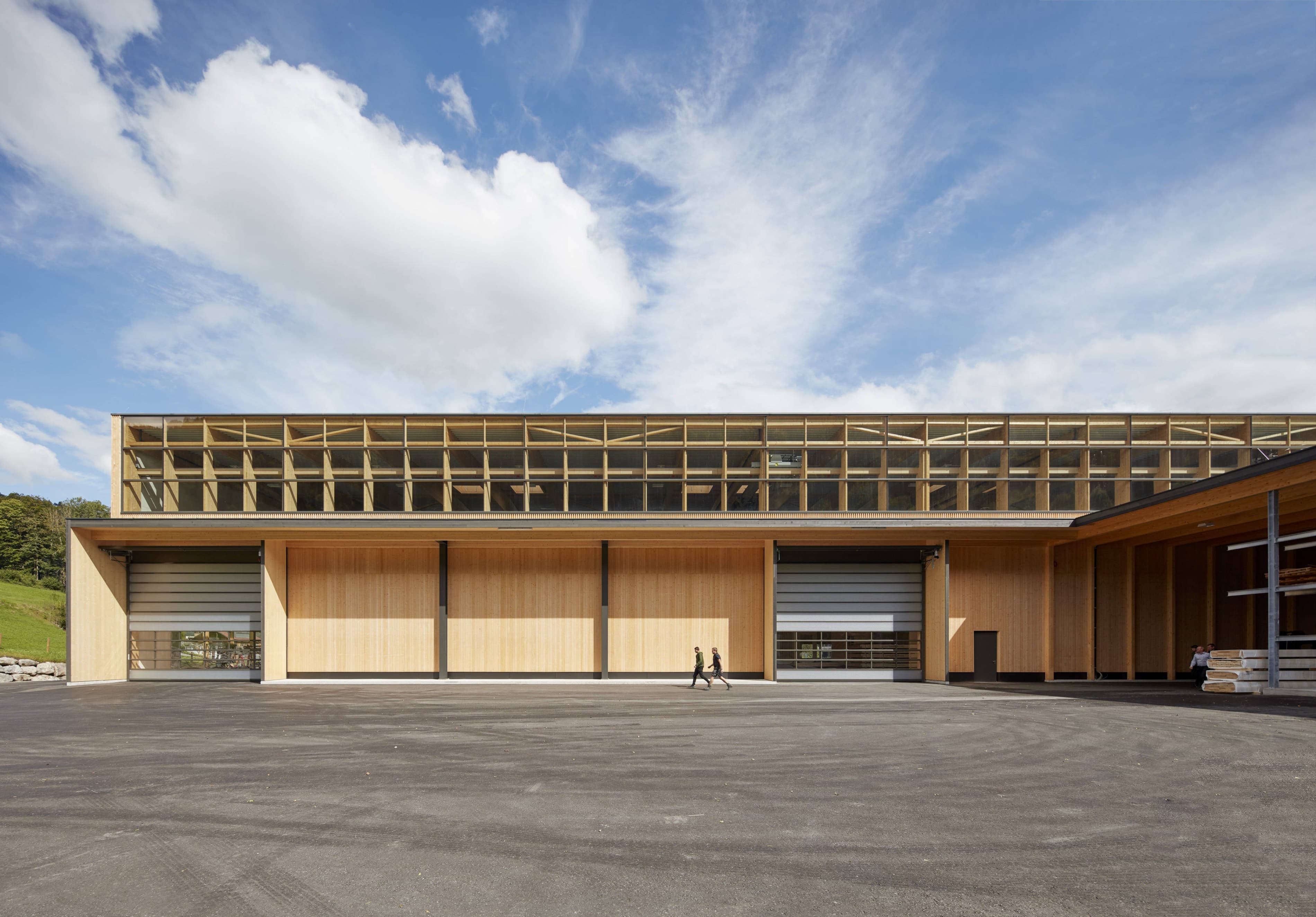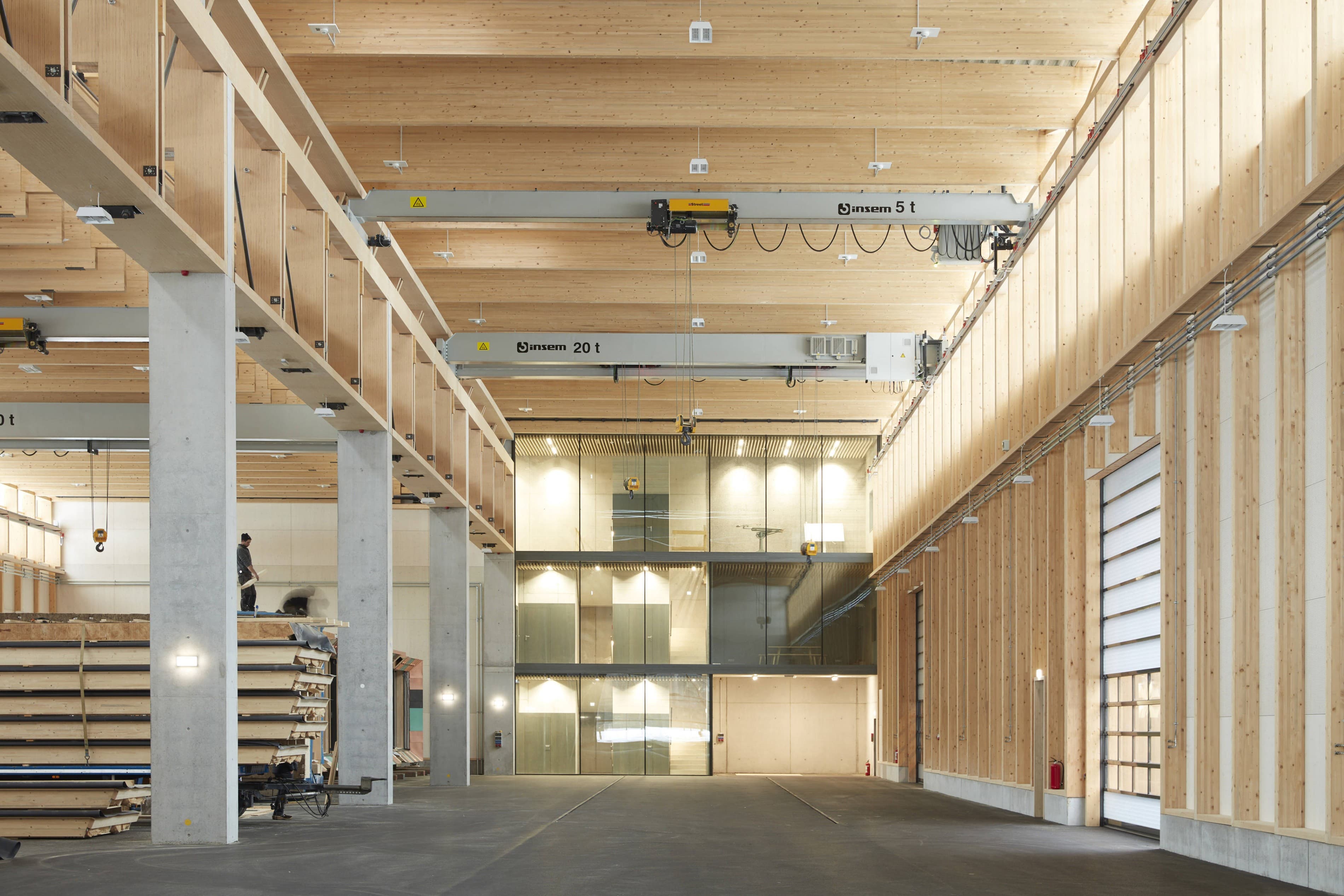 Die Zimmerei Tischlerei Kaufmann im Bregenzerwald ist ein Familienunternehmen in 4. Generation und beschäftigt sich neben moderner Holzbautechnologie auch mit dem Bau von Projekten in Raumzellenbauweise. Diese platzintensive Produktionsmethode erforderte den Neubau einer neuen Montagehalle zur Herstellung dieser modularen Raumzellen. Die Halle ist in 2 „Hallenschiffe“ unterteilt. Ein Längsschiff mit Geleisen ist für die Herstellung reserviert, im zweiten Schiff werden die fertigen Module gelagert.
